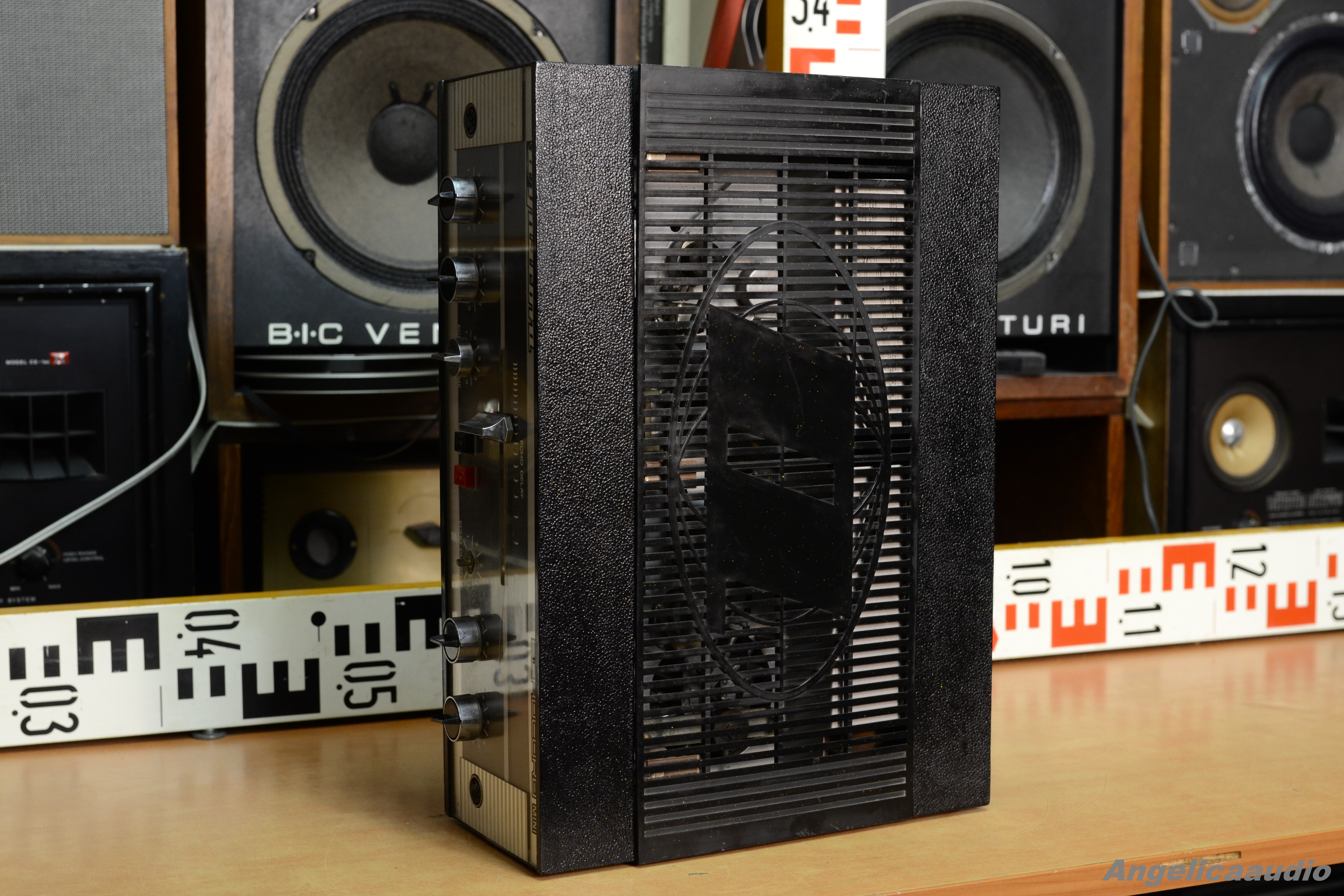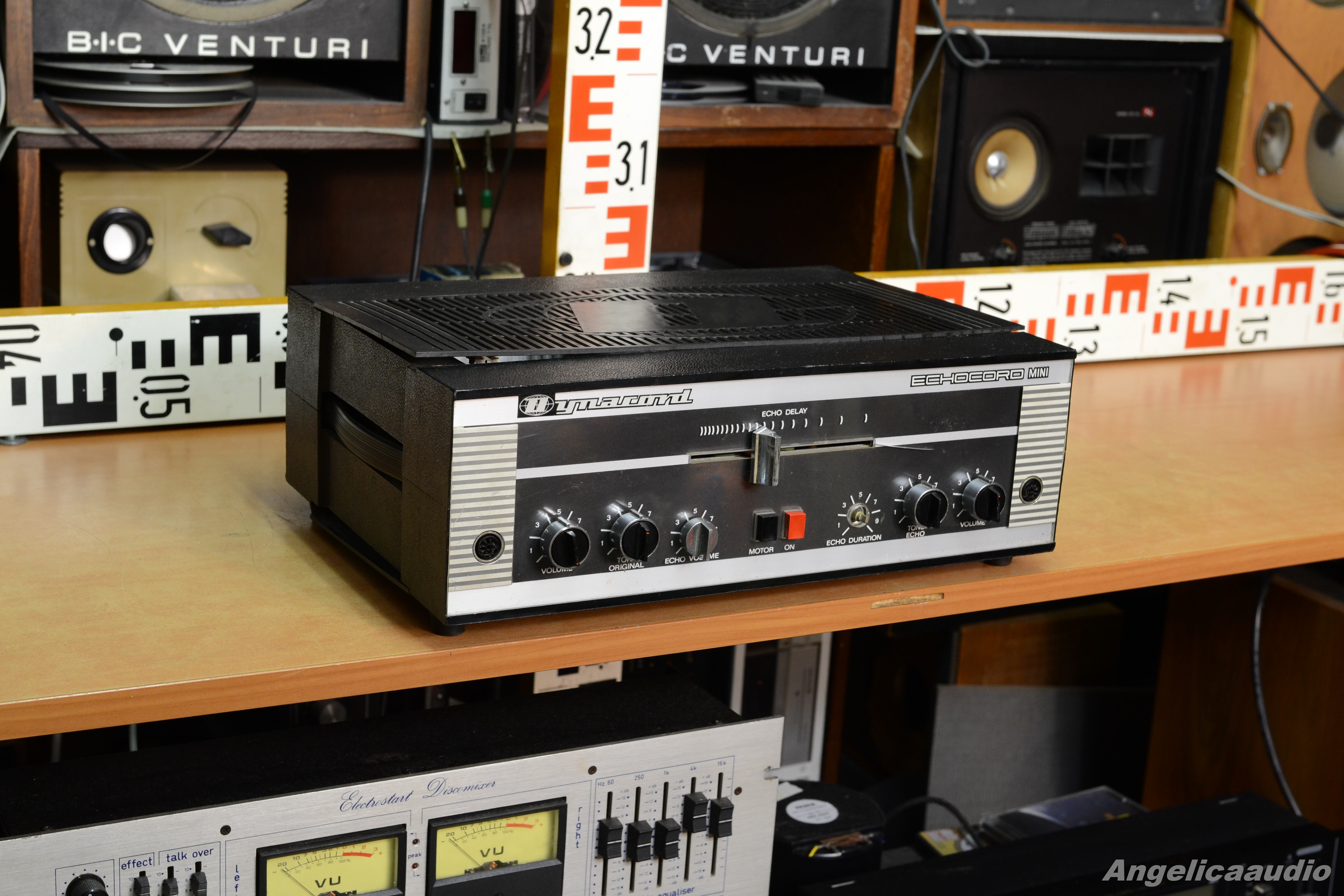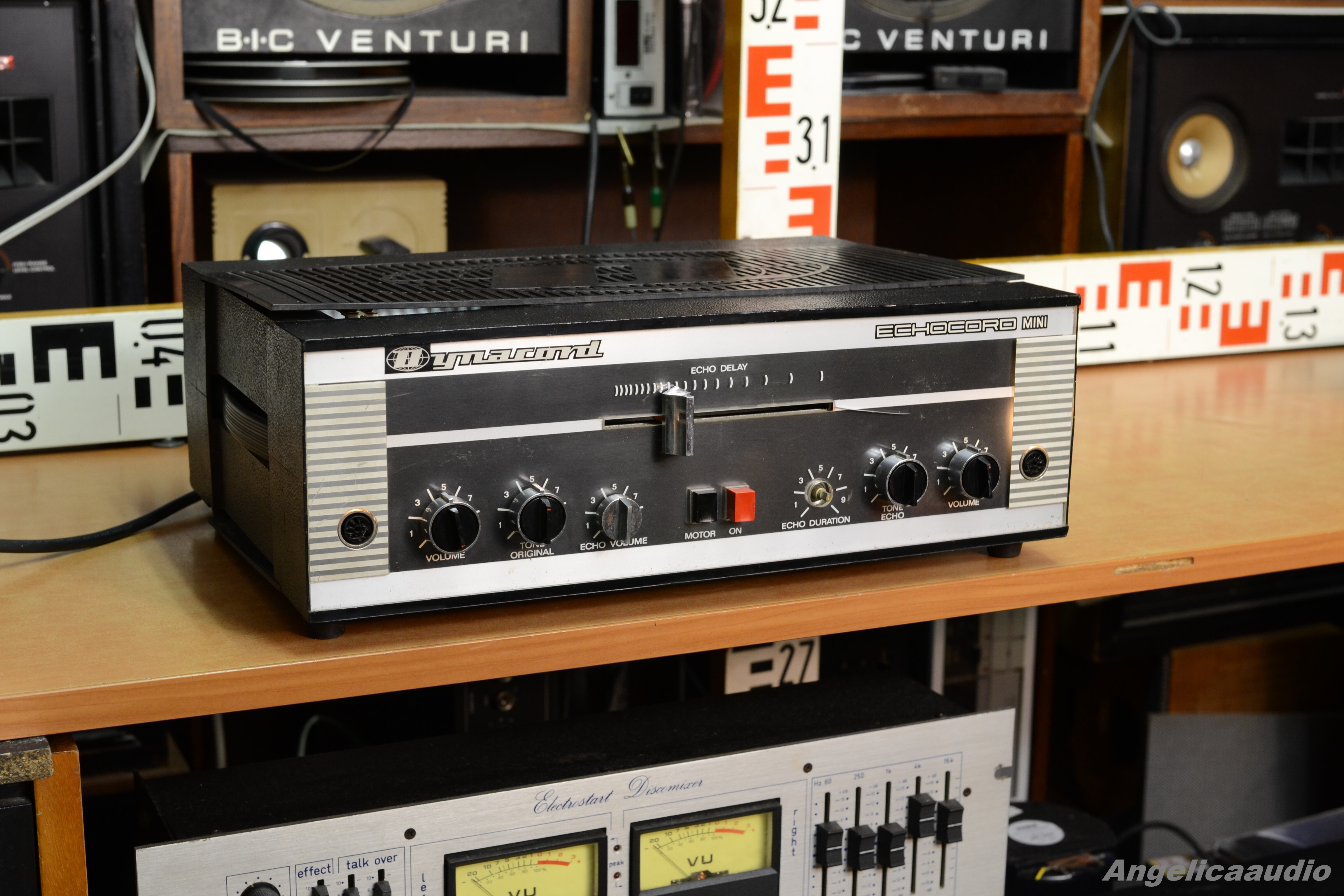 Dynacord Echocord-Mini, Tape Delay, výroba W. Germany cca r. 1967. Vzhled viz foto – tj. volnější horní a spodní kryt. Chybí jeden originální knoflík, prasklina v krycím plexi. Zařízení neotvíráno. Při pohledu skrz horní mřížku je vidět, že páska je volná a pravděpodobně přetržená. Po zapnutí do sítě a zmáčknutí vypínače se zařízení rozsvítí a při zmáčknutí druhého vypínače se slyšitelně rozeběhne motorek (zvuk motorku O.K.) – viz video. Nic dalšího nezkoušeno.