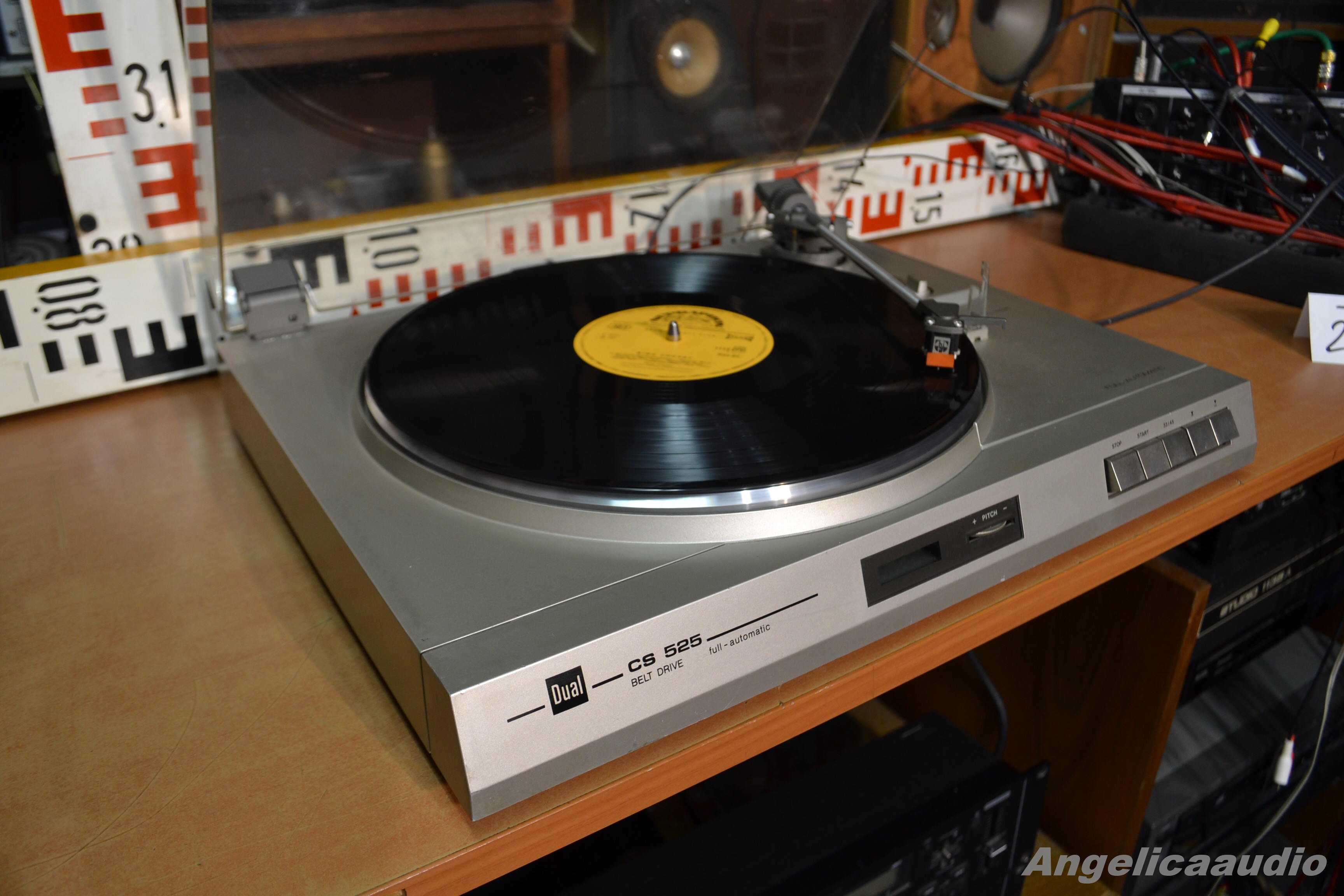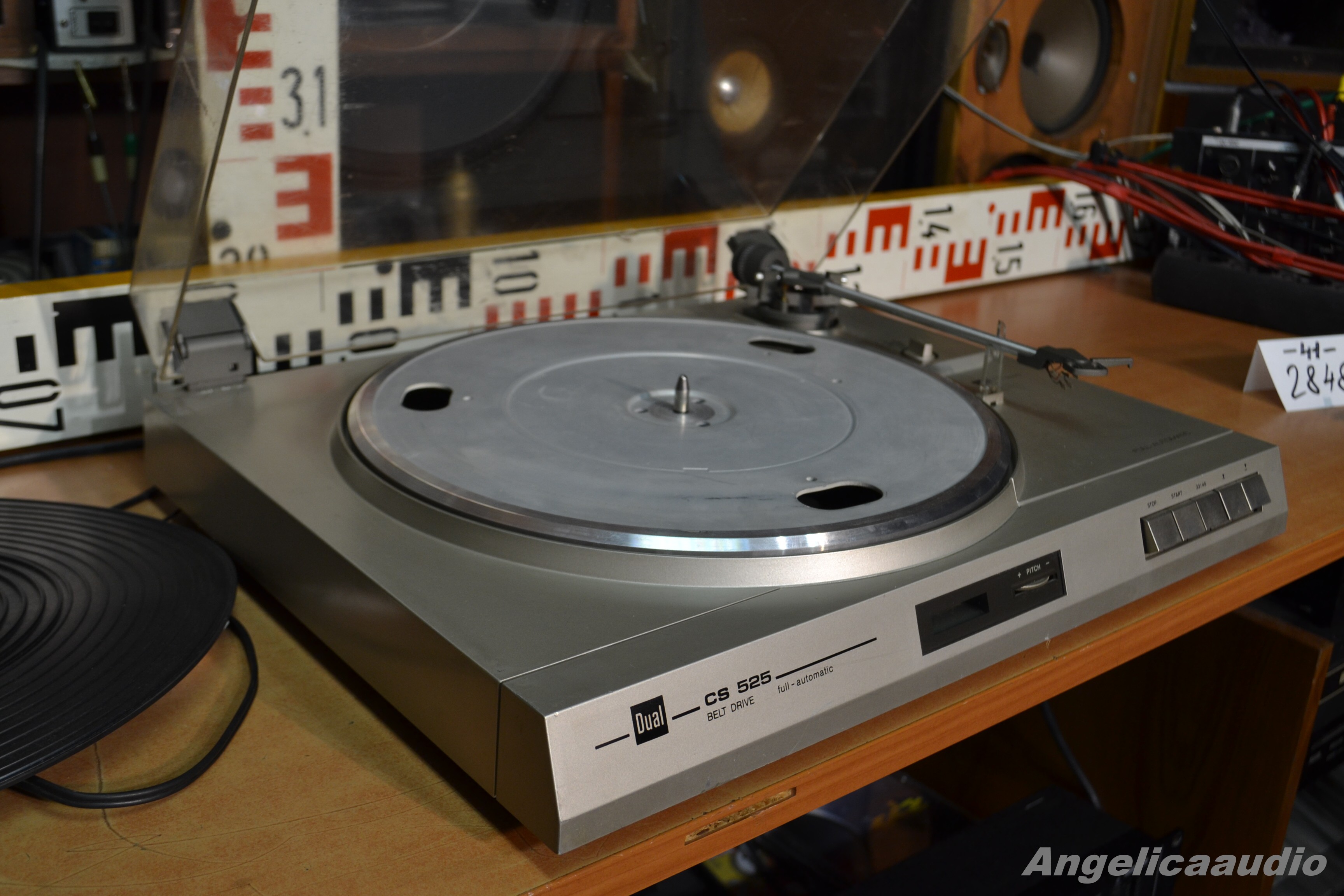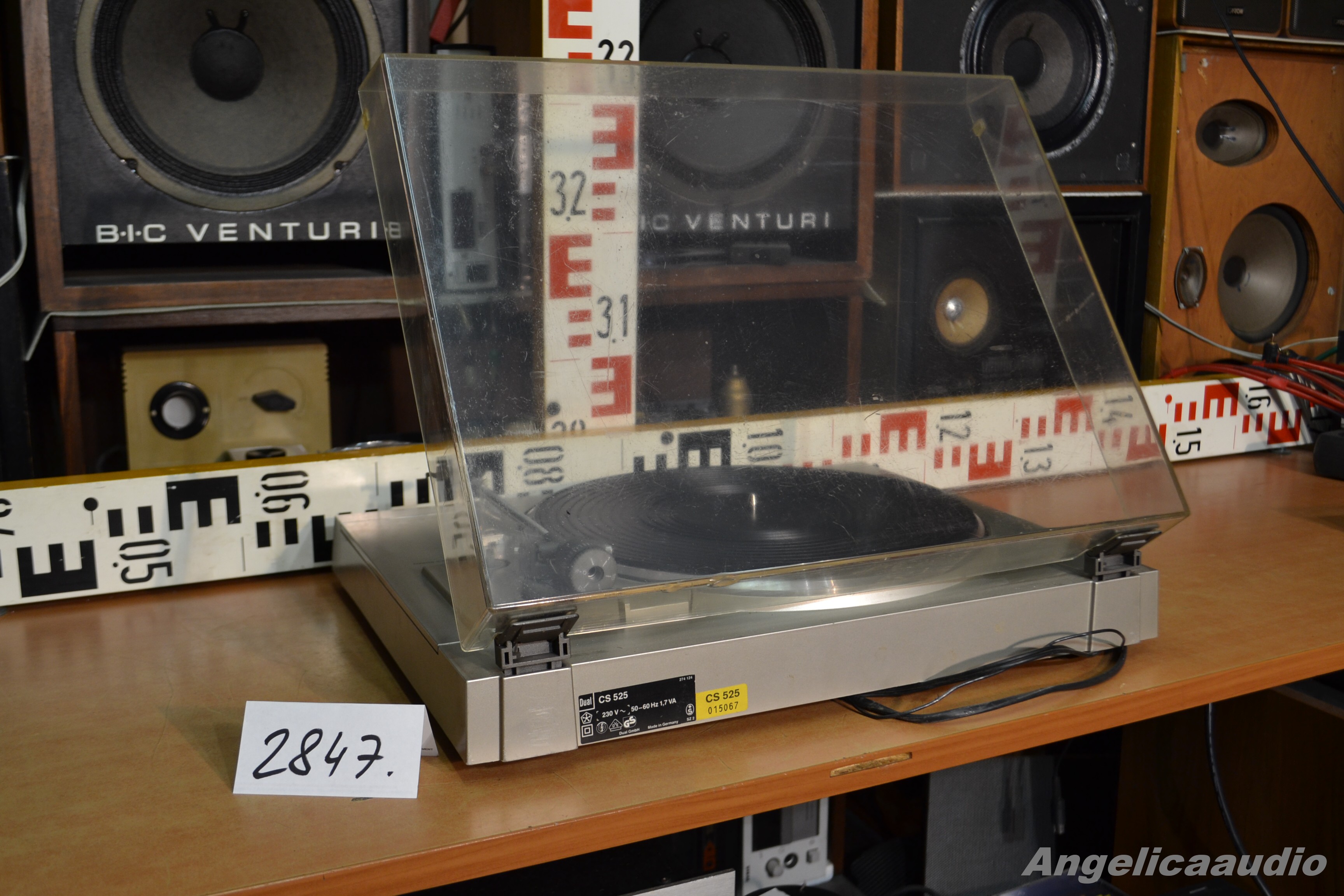 Gramofon Dual CS 525. Bez přenosky Tesla – přenoska použita pouze pro odzkoušení gramofonu (přenoska pod pořadovým číslem 41-2848 v jiné nabídce samostatně). Automatika má sice snahu, ale raménko se neposune do správné polohy. Stroboskop svítí, regulace „reguluje“. Zařízení neotvíráno – chyba nehledána. Je možné, že bude stačit vyčištění a promazání, je možné že to bude něco vážnějšího. Jeden konektor RCA-cinch má kratší kabel.