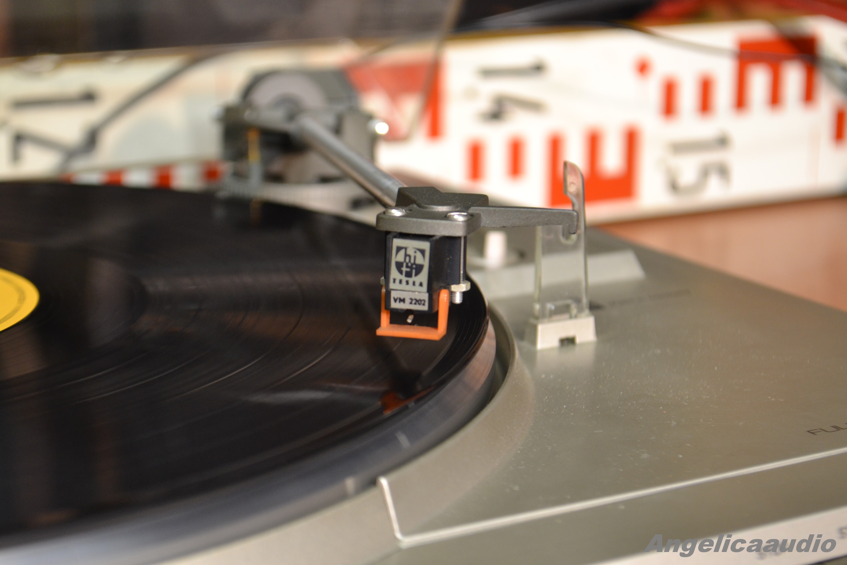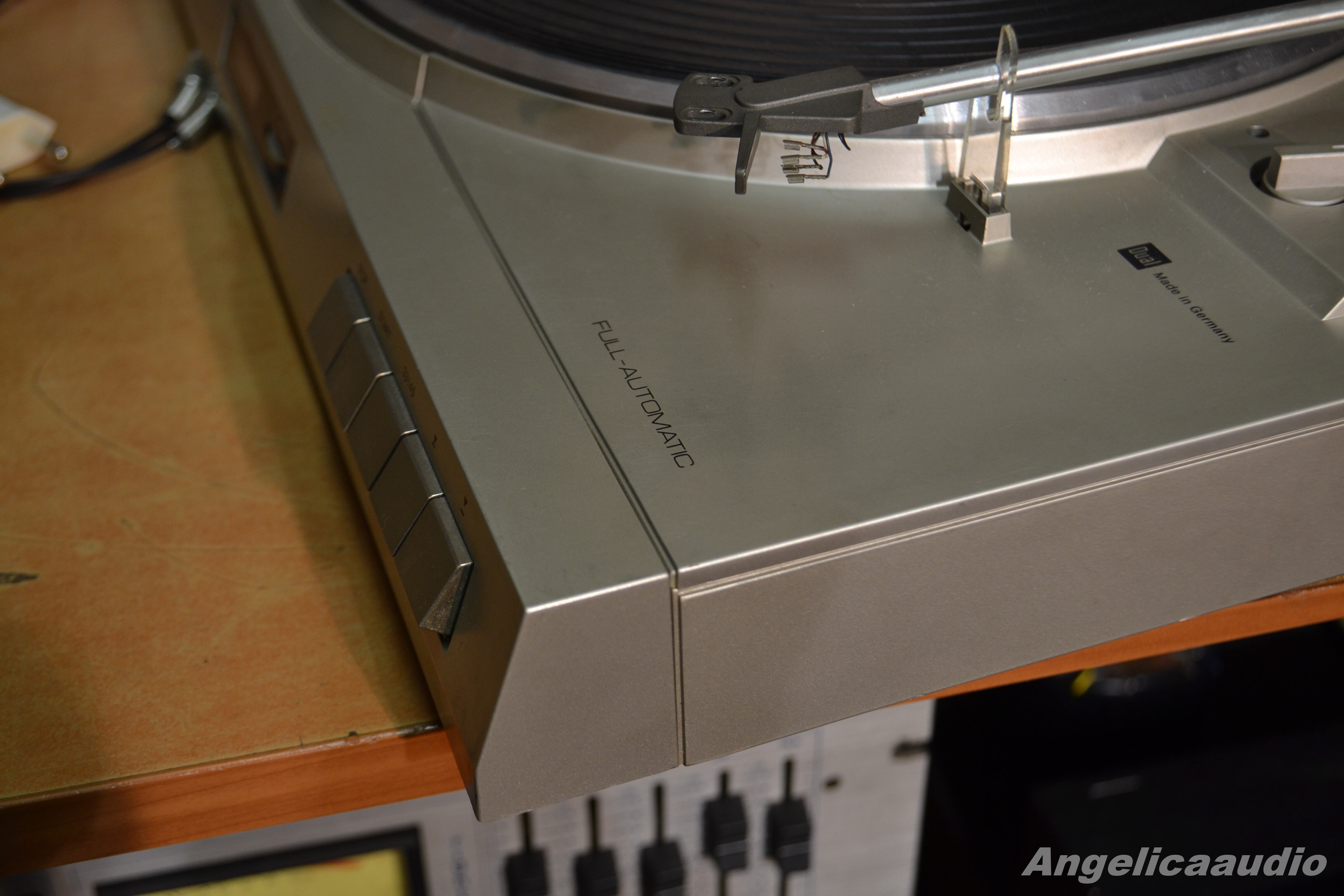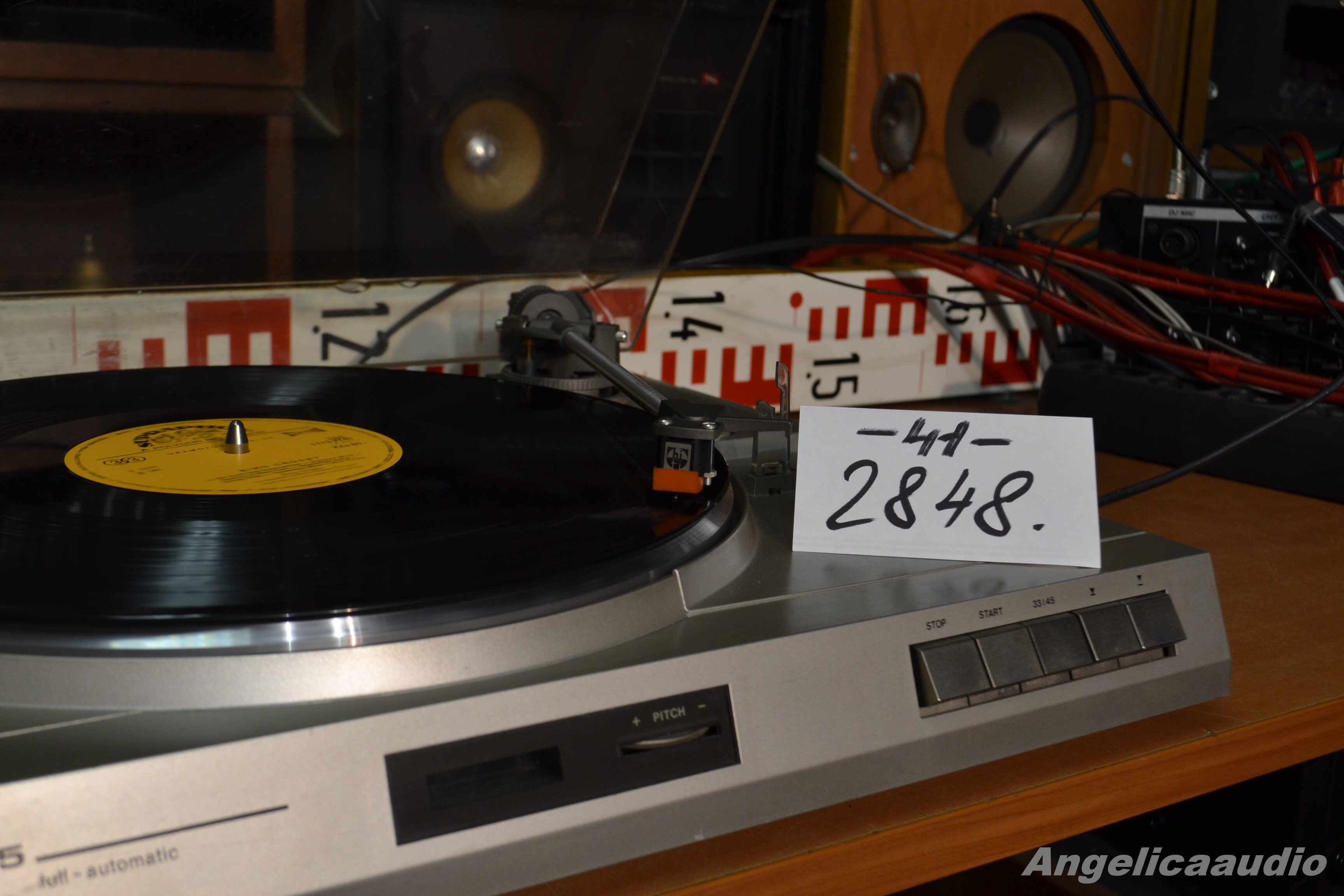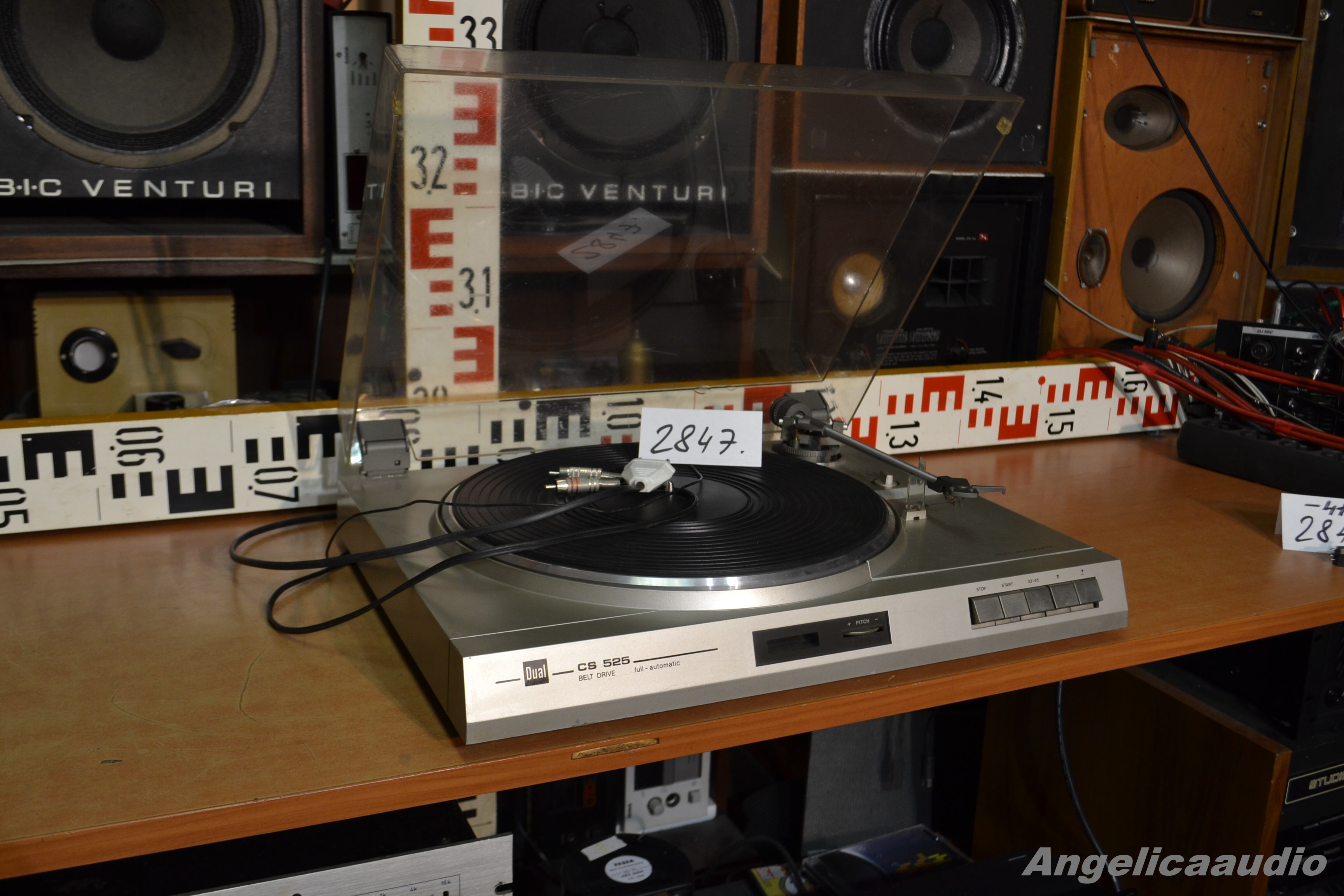 Gramofon Dual CS 525. Bez přenosky Tesla – přenoska použita pouze pro odzkoušení gramofonu (přenoska pod pořadovým číslem 41-2848 v jiné nabídce samostatně). Automatika má sice snahu, ale raménko se neposune do správné polohy. Stroboskop svítí, regulace „reguluje“. Zařízení neotvíráno – chyba nehledána. Je možné, že bude stačit vyčištění a promazání, je možné že to bude něco vážnějšího. Jeden konektor RCA-cinch má kratší kabel.