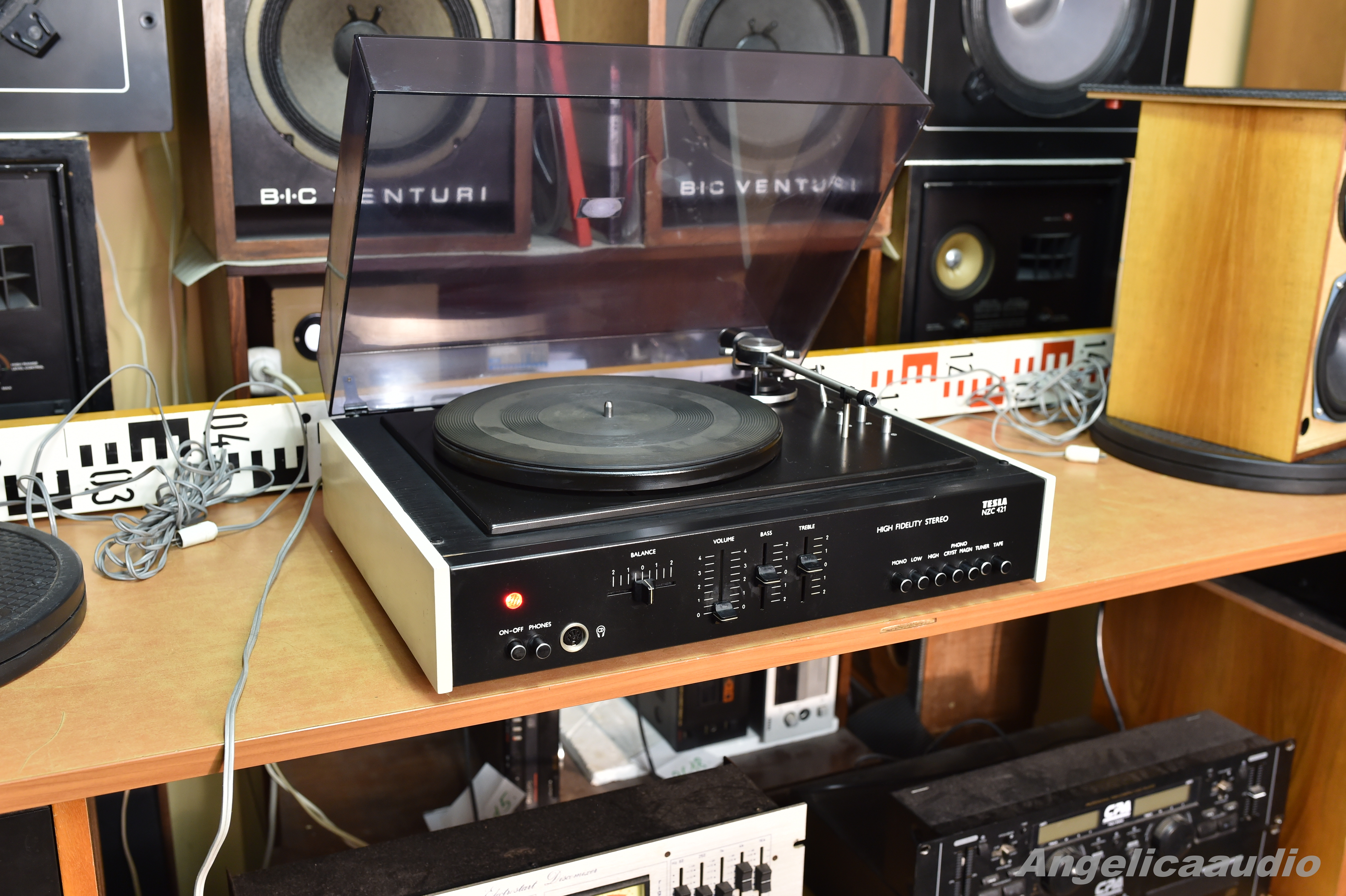 Tesla NZC 421 – gramofon s integrovaným stereo zesilovačem. Vzhled viz foto. Funkčnost viz video. Cena je uvedena bez hlavičky přenosky a bez přenosky (konkrétně tuto hlavičku s přenoskou co je na videu s funkčností gramofonu naleznete v mé další nabídce za 999,- CZK). Poškozené plexi.