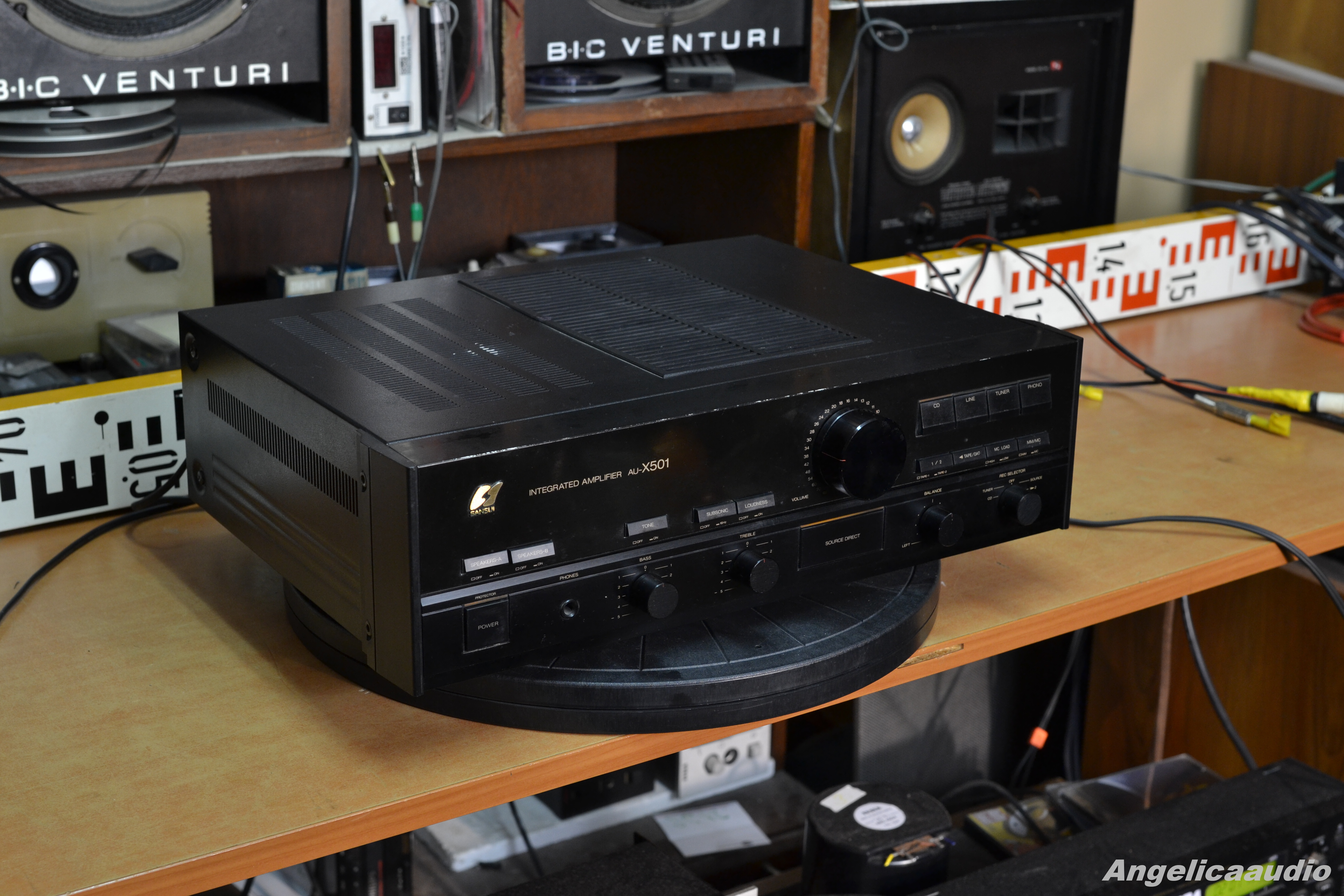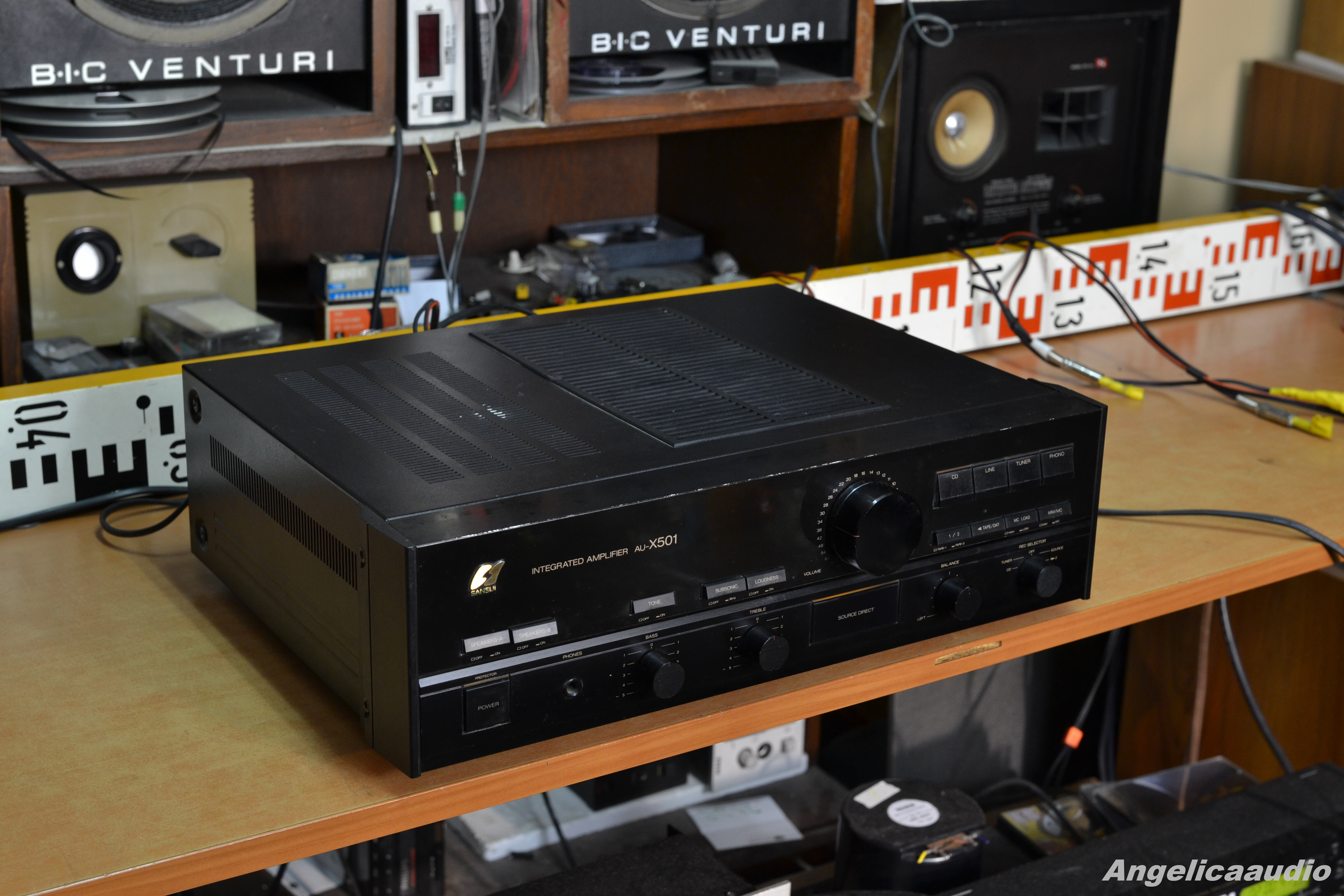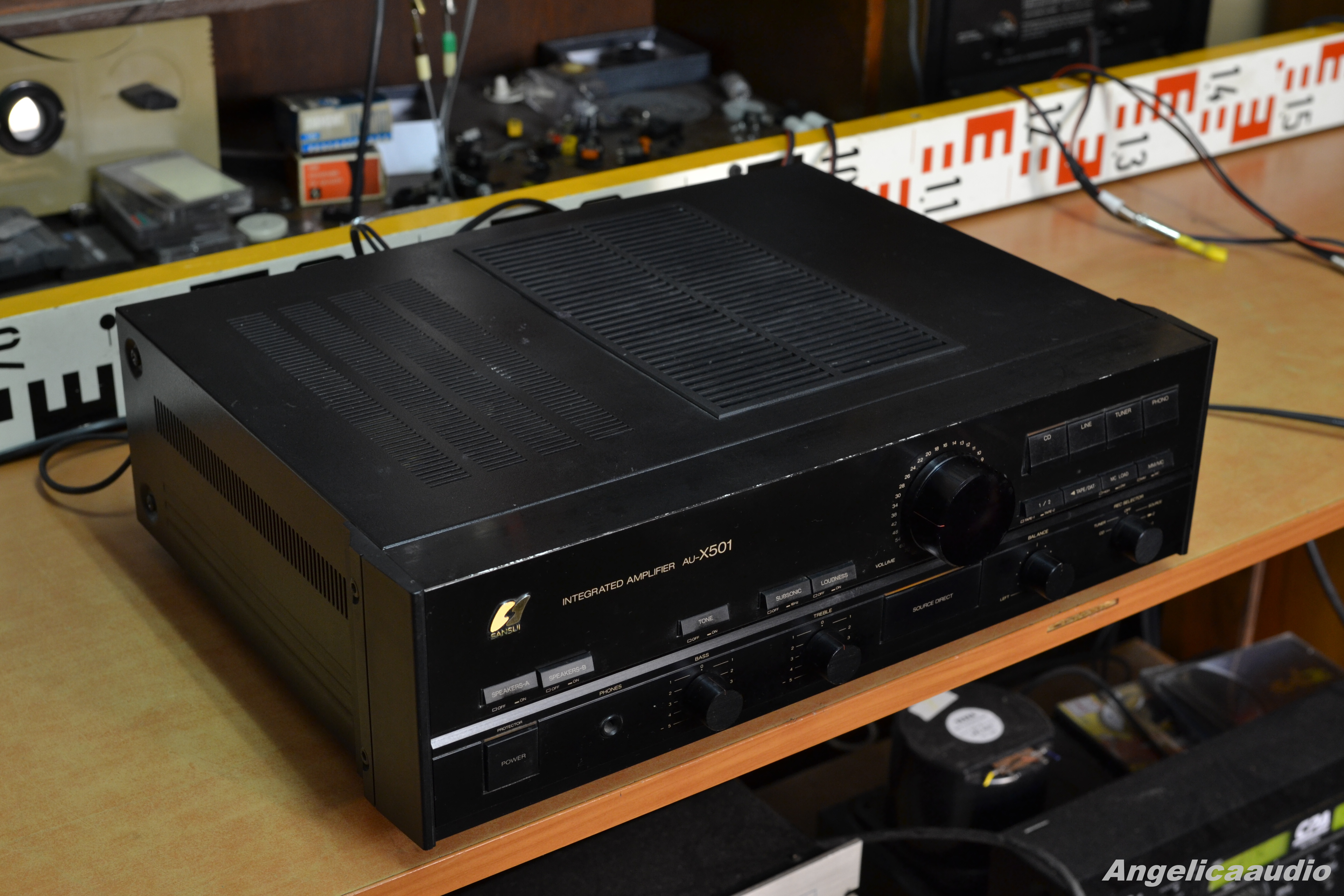 Sansui AU-X501 stereo amplifier, made in Japan, year 1987-1990, weight ca. 11 KG, Power output: 80 watts per channel into 8Ω (stereo), Speaker load impedance: 4Ω to 16Ω, Dimensions: 448 x 135 x 370mm, Input power 690 Watts. Vzhledový stav viz detailní fotografie – tj. vzhledové vady na horním krytu, na hranách, poškození na spodním krytu. Funkčnost viz video. Zařízení hraje na oba kanály.