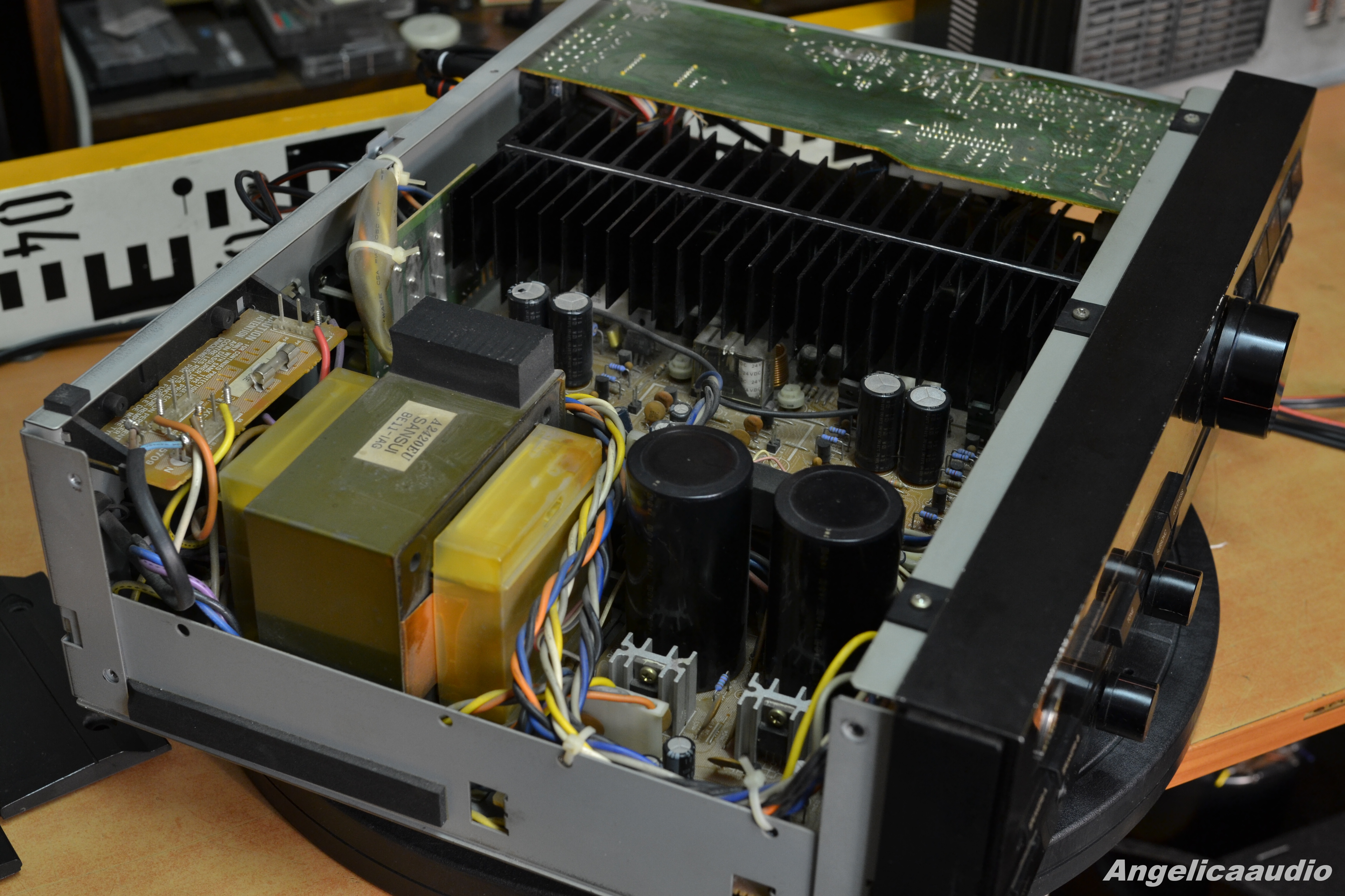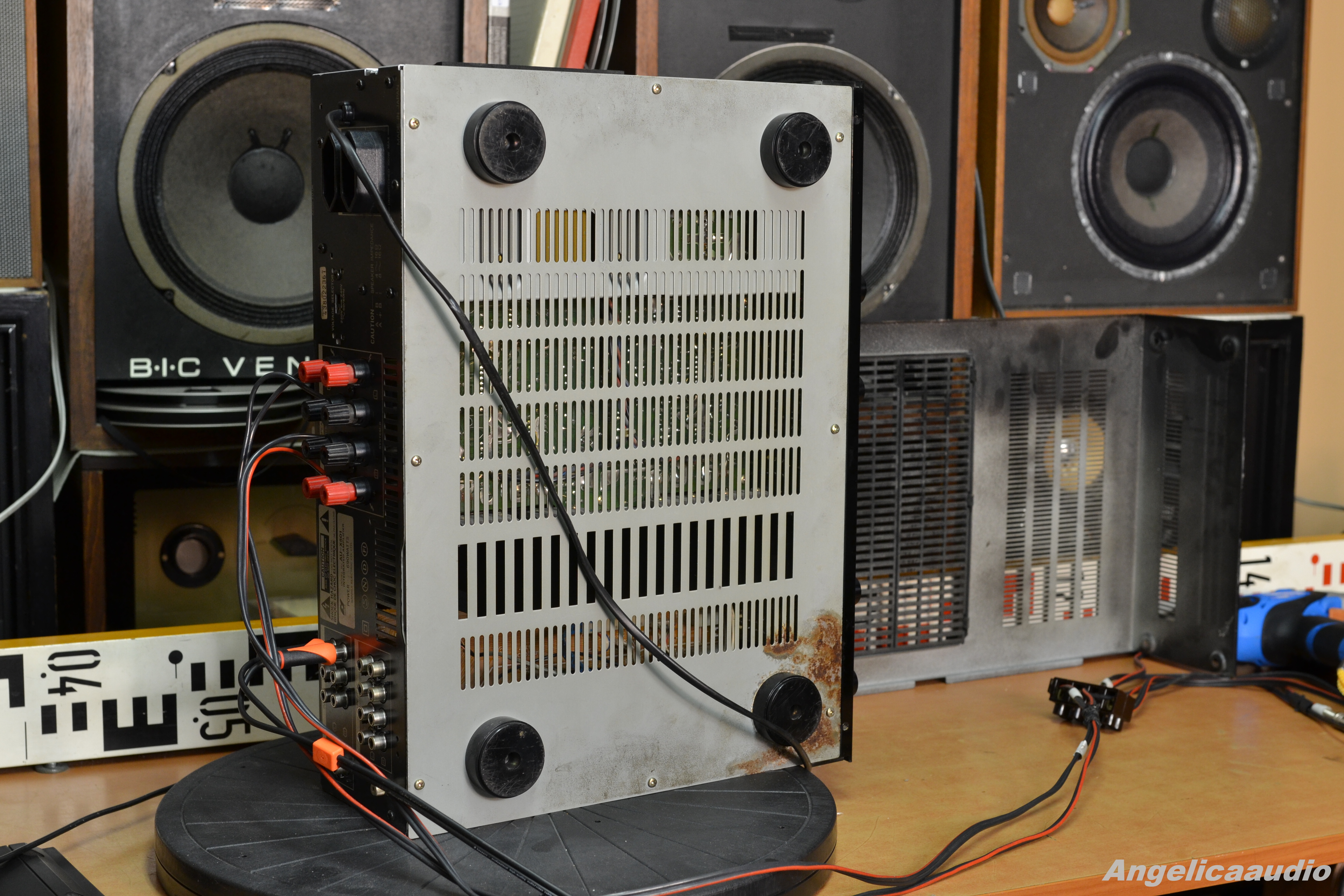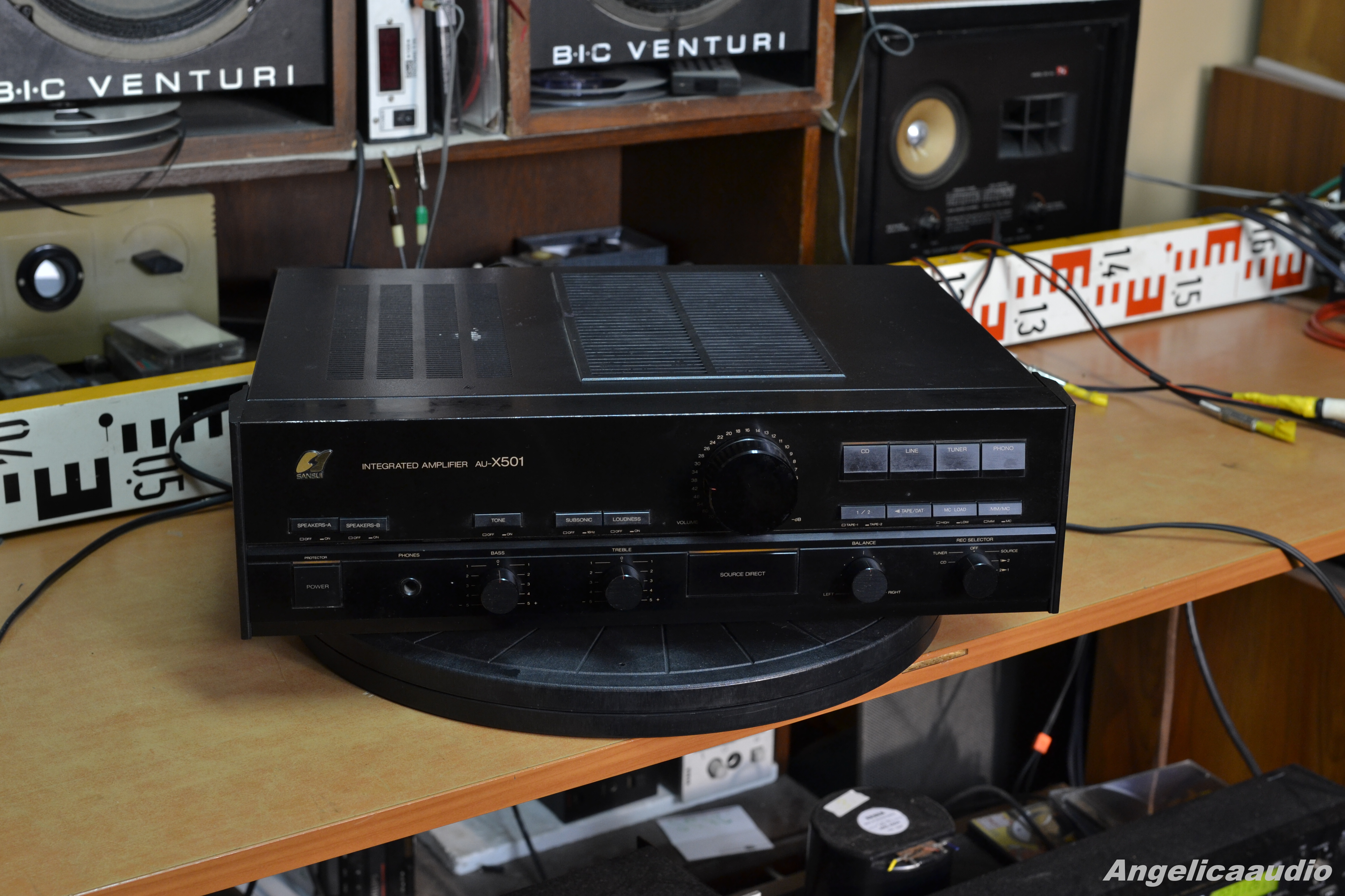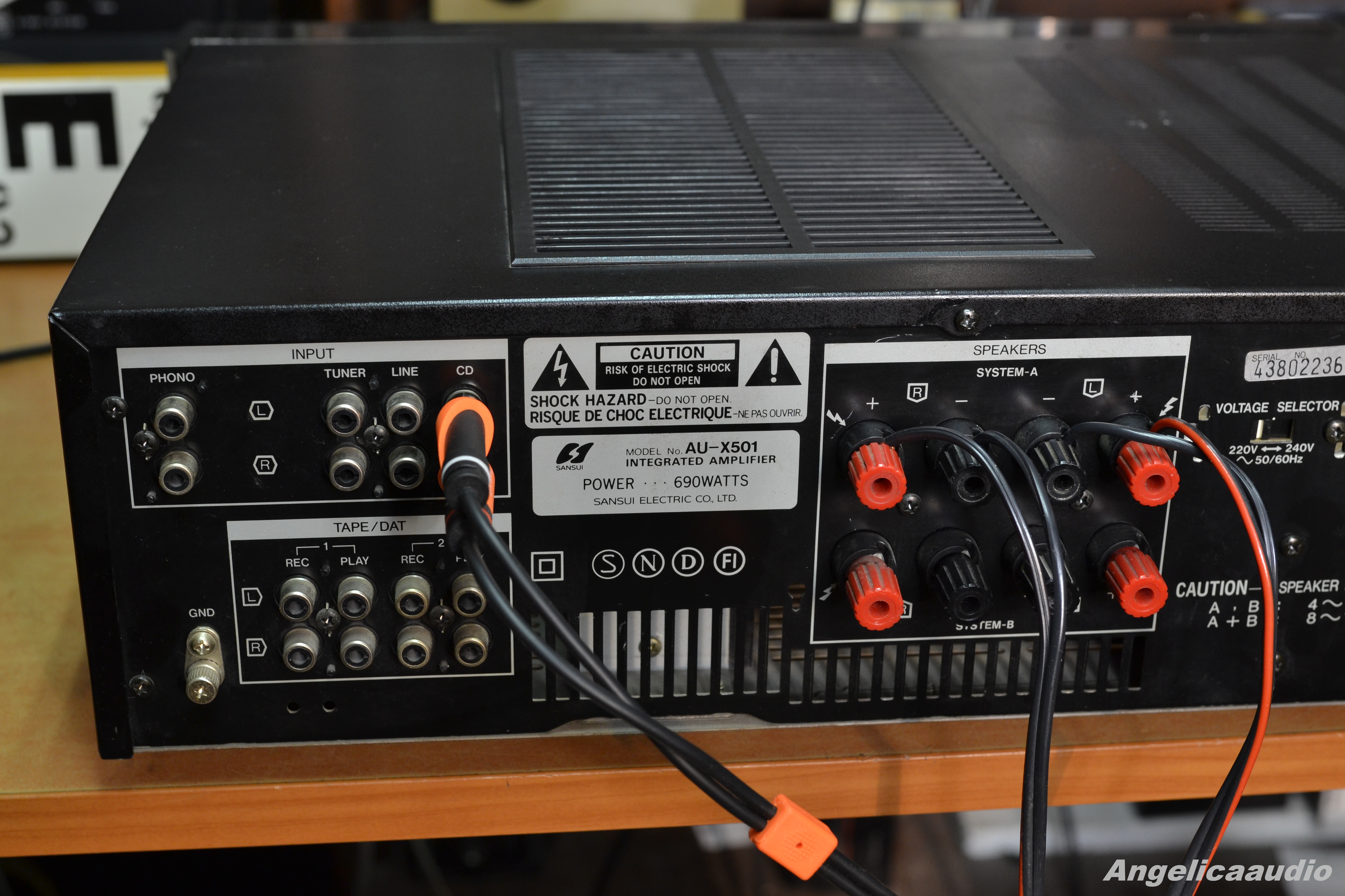 Sansui AU-X501 stereo amplifier, made in Japan, year 1987-1990, weight ca. 11 KG, Power output: 80 watts per channel into 8Ω (stereo), Speaker load impedance: 4Ω to 16Ω, Dimensions: 448 x 135 x 370mm, Input power 690 Watts. Vzhledový stav viz detailní fotografie – tj. vzhledové vady na horním krytu, na hranách, poškození na spodním krytu. Funkčnost viz video. Zařízení hraje na oba kanály.