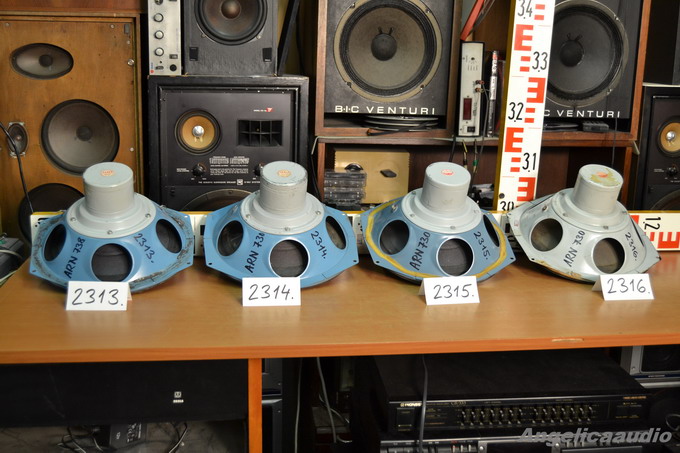 Hlubokotónové reproduktory Tesla ARN 738 a Tesla ARN 730. Vzhled viz detailní fotografie na odkazu níže. Funkčnost viz video na odkazu níže. Impedance O.K. U reproduktoru pořadového čísla 2314 zvlněná středící vlnková membrána (cívka nedrhne). Cena/pořadové číslo: 749/2313, 499/2314, 749/2315, 999/2316.