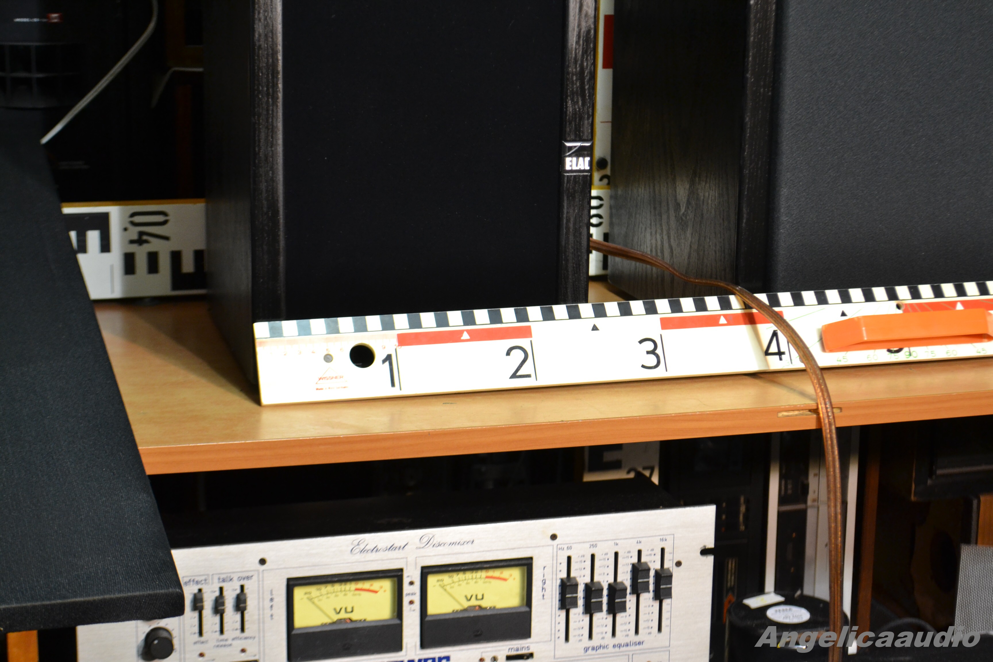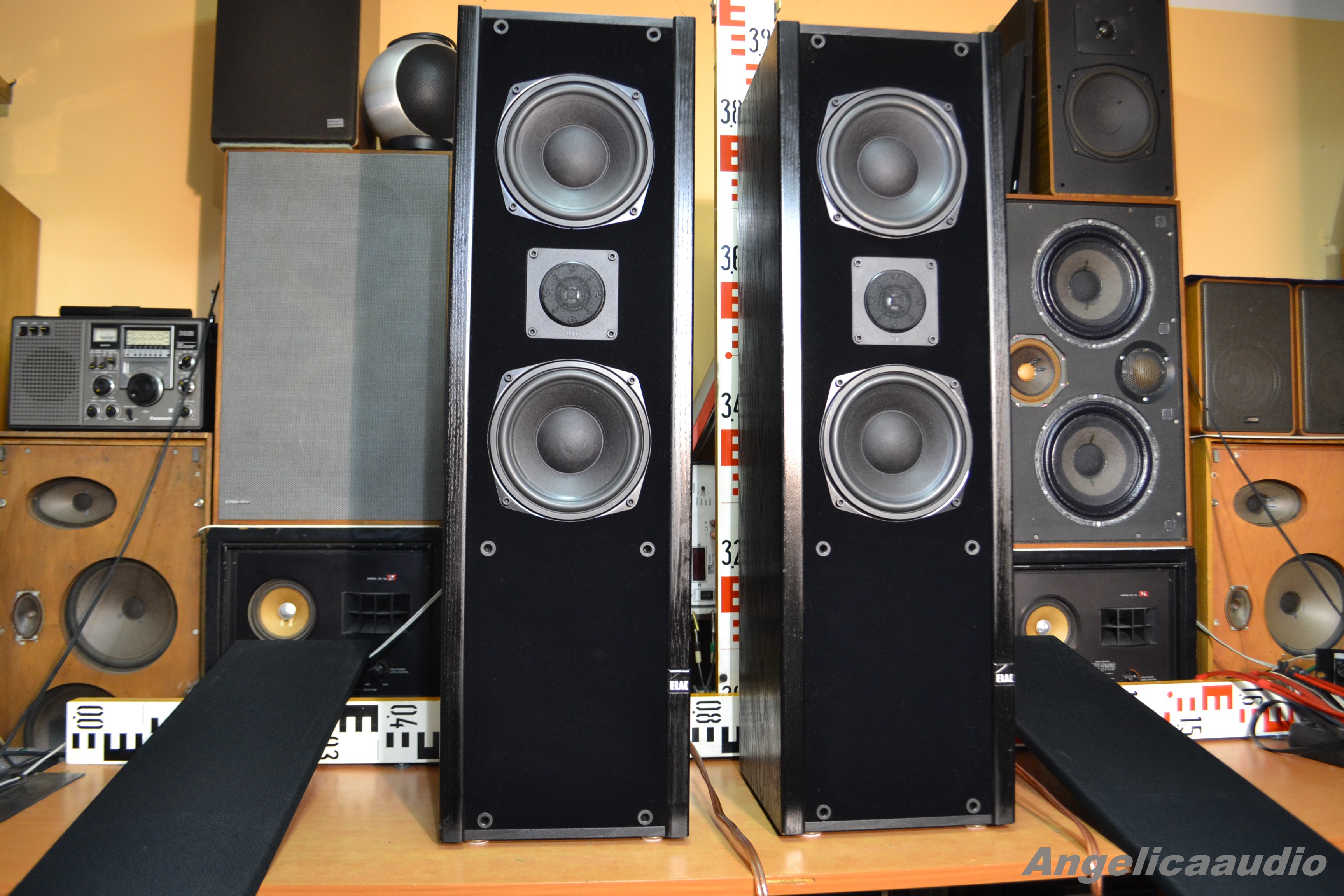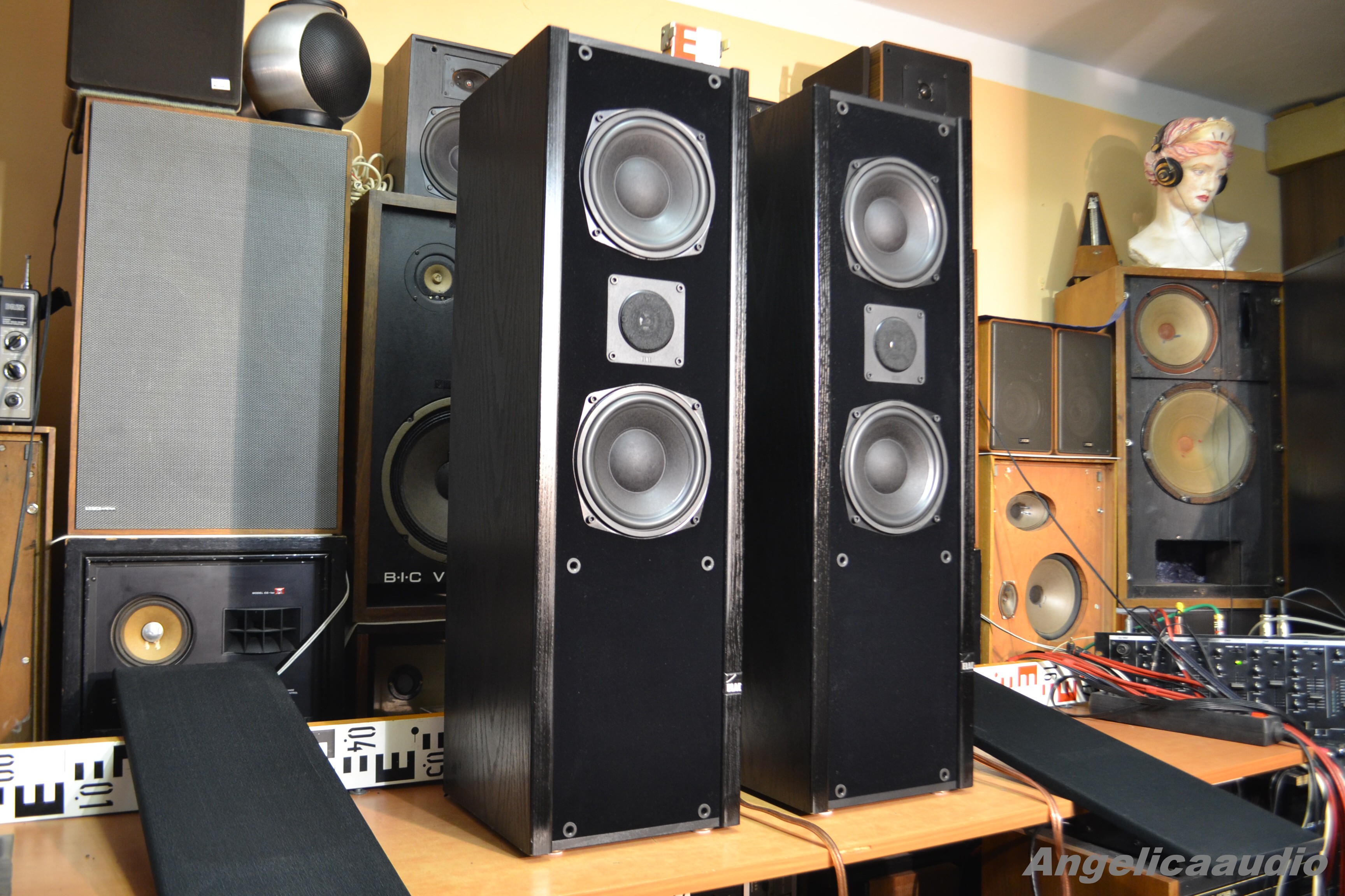Kvalitně zpracované a také patřičně těžké sloupové reprosoustavy ELAC. Výroba Německo. Dvojitý bassreflex na zadních deskách – možná regulace pomocí originálních záslepek – viz detailní fotografie. „Sametový“ potah čelních desek.