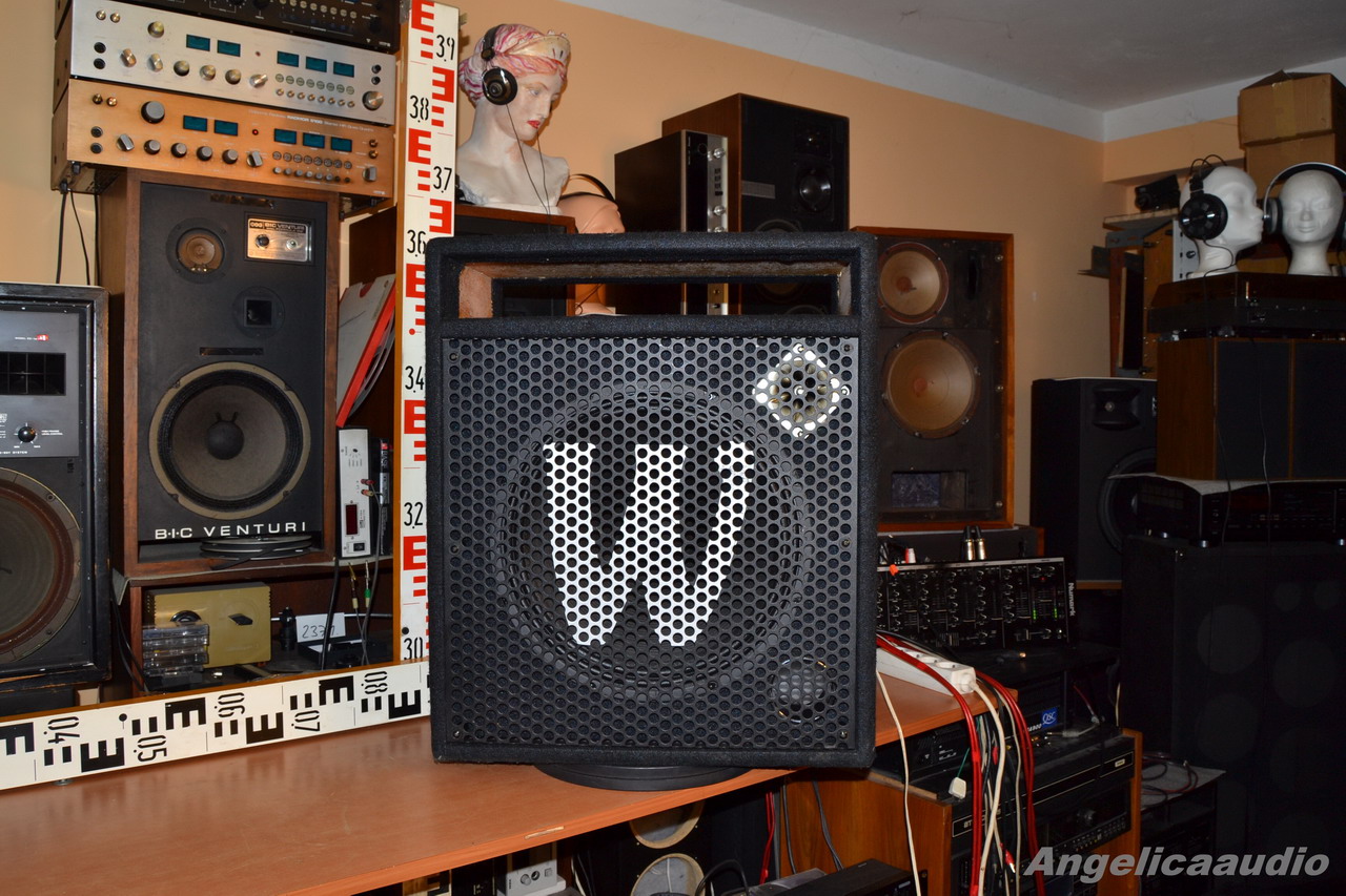 Pasivní Box Warwick – původně kompletní kombo Warwick Sweet 15.2., ze kterého jsem demontoval nefunkční zesilovač (zesilovač naleznete v mé další nabídce jako zařízení k opravě). Box je osazen hlubokotónovým reproduktorem Warwick XWCP99065-T15 (150W, 4 ohm). Výškový reproduktor v boxu sice je, ale není funkční). Pro odzkoušení jsem k přívodům basového reproduktoru přiletoval běžnou dvoulinku (viz foto), protože originální kabel je zakončen jackem a nechtěl jsem tento originální kabel rozebírat či poškodit (třeba si někdo zakoupí i zesilovač a po jeho opravě zkompletuje kombo do původního stavu – zesilovač šlo lehce vysunout po vyšroubování 4 šroubů z horní desky boxu – montáž zesilovače do boxu je otázkou cca 1 minuty). Vzhled viz detailní fotografie na odkazu níže – box má po stranách 2 zapuštěné uši a ze zadní strany sklápěcí nohu, pro opření do šikmé polohy – viz další fotky. Funkčnost viz video na odkazu níže. Hlubokotónový reproduktor je ve výborném stavu – pouze na membráně stopy po nějakém „ocáknutí“ – nečištěno, pouze mírně oprášeno štětečkem, závěs membrány perfektní, středící membrána perfektní,,, prostě viz detailní fotky.