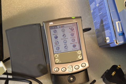 Palm m515. Včetně příslušenství – originální krabice (mírně poškozená), příbalové materiály včetně 2CD s programy, 2 síťové zásuvky (nějaké zahraniční adaptéry), síťový zdroj, kabel, základnová stanice, pouzdro, diářové pouzdro se suchým zipem pro uchycení zařízení a dalším stylusem. Stylusy (tužky) tedy celkem 2ks – jeden originální zasunutý v zařízení, druhý v pouzdře. Celkově vypadá zařízení výborně – snad jako kdyby ani nebylo používané.