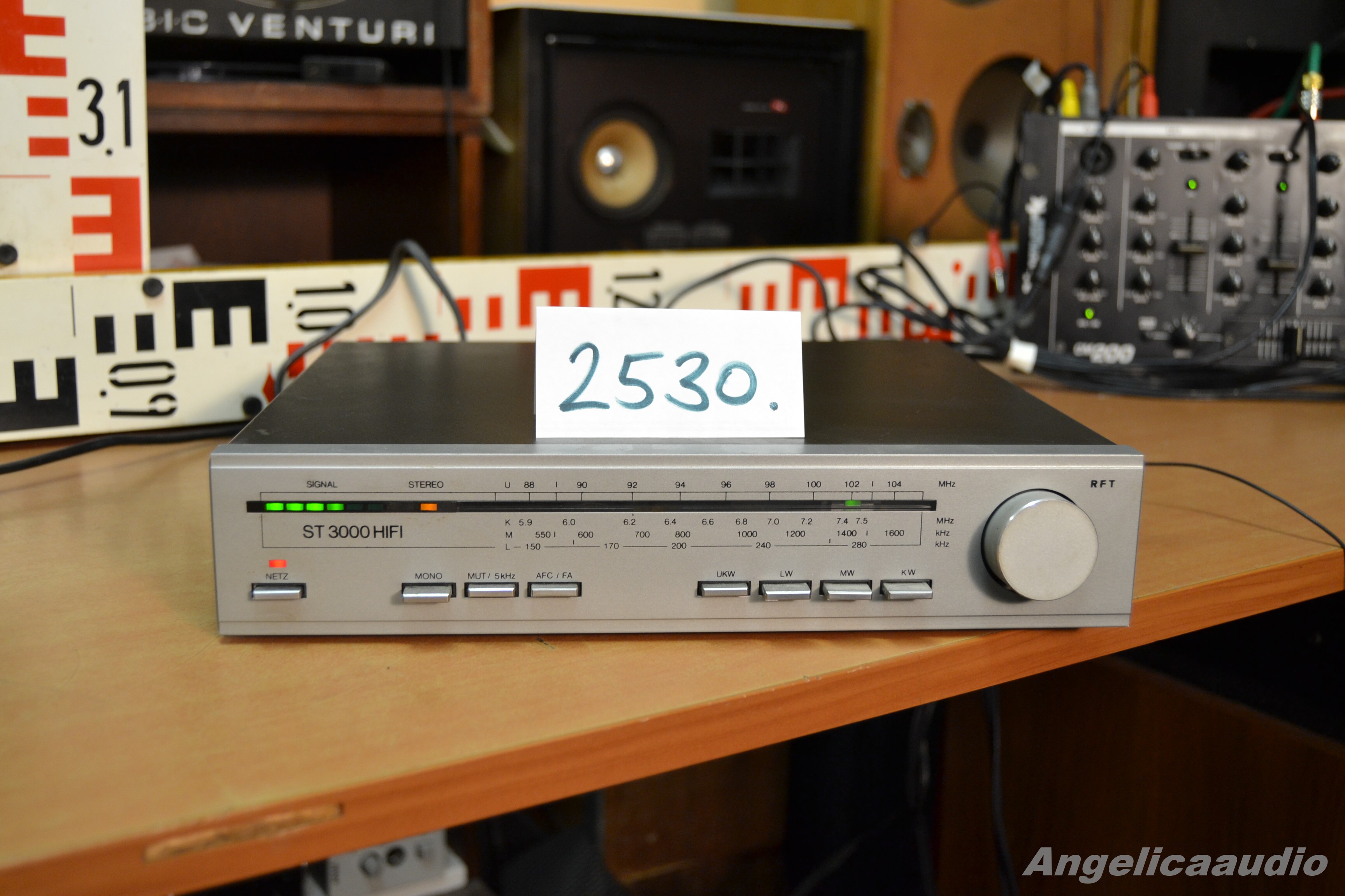 RFT ST3000 HIFI Stereo Tuner. Vzhled viz detailní fotografie na odkazu níže. Funkčnost viz video. FM ladí velmi slušně. Ostatní rozsahy neladí – kousnutý ladící kondenzátor. Aby bylo možné posouvat lanko a ladit FM, tak jsem promáznul hřídelky a povolil šroubek řemeničky u ladění ostatních kmitočtů – řemenička kousnutého kondenzátoru se teď volně protáčí na hřídelce kondenzátoru a ladění FM šlape bez problémů. Na videu zkoušeno na kousek drátu dole v poslechovce, kde je mizerný signál – výsledek vidíte na videu.