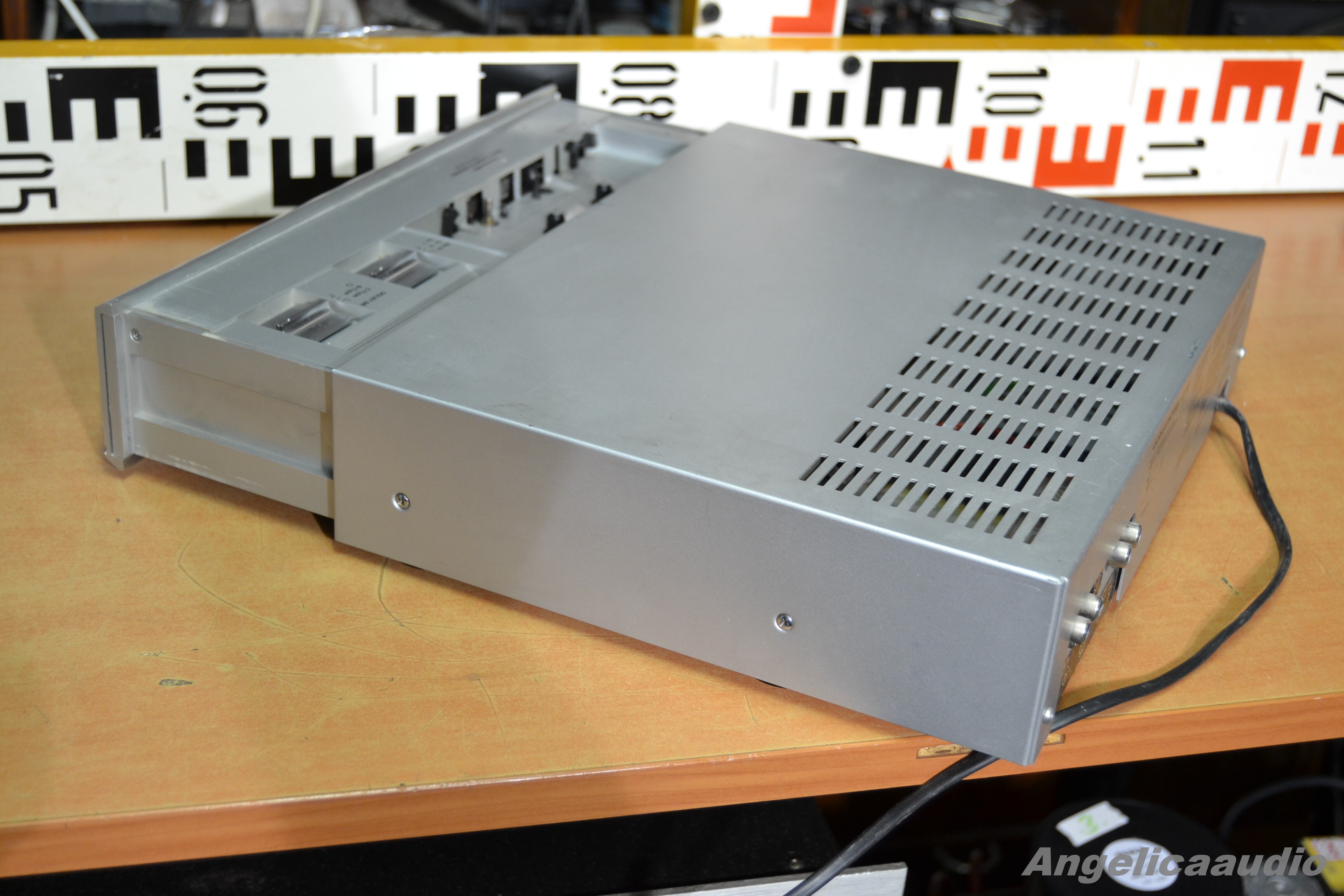 GRUNDIG CF 30 tape deck k opravě. Poškozené ozubené kolečko vysouvání šuplíku (spodní kolečko co zapadá do ozubené lišty na dně šasí, několik vylomených zoubků). Vzhled viz detailní fotky níže – velmi výrazné stopy používání a různé vady. Funkčnost – či spíše nefunkčnost viz video výše.