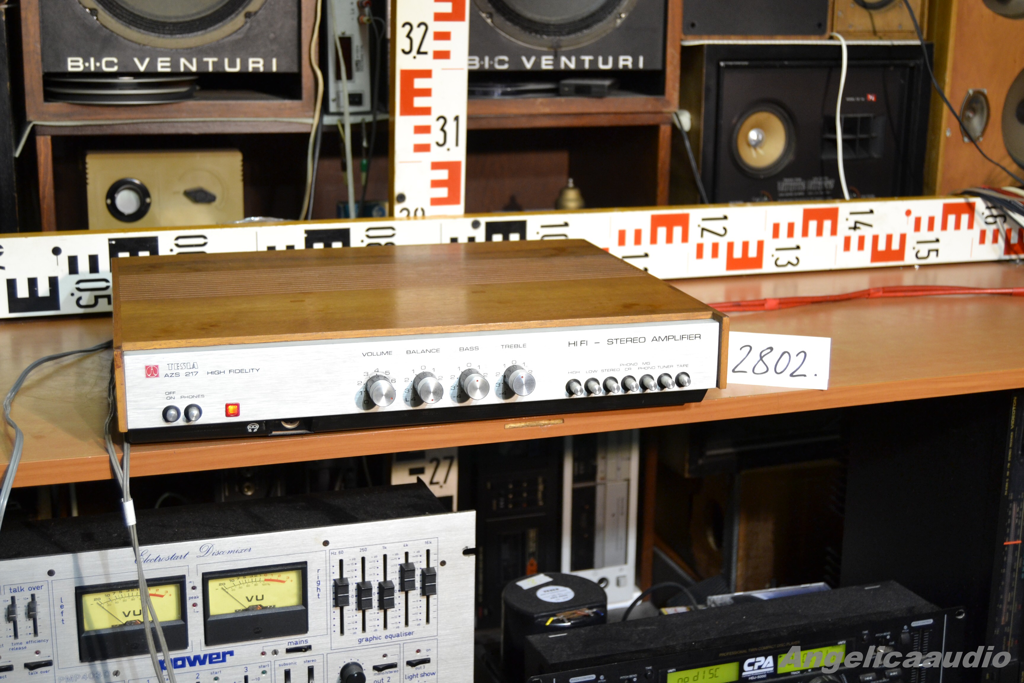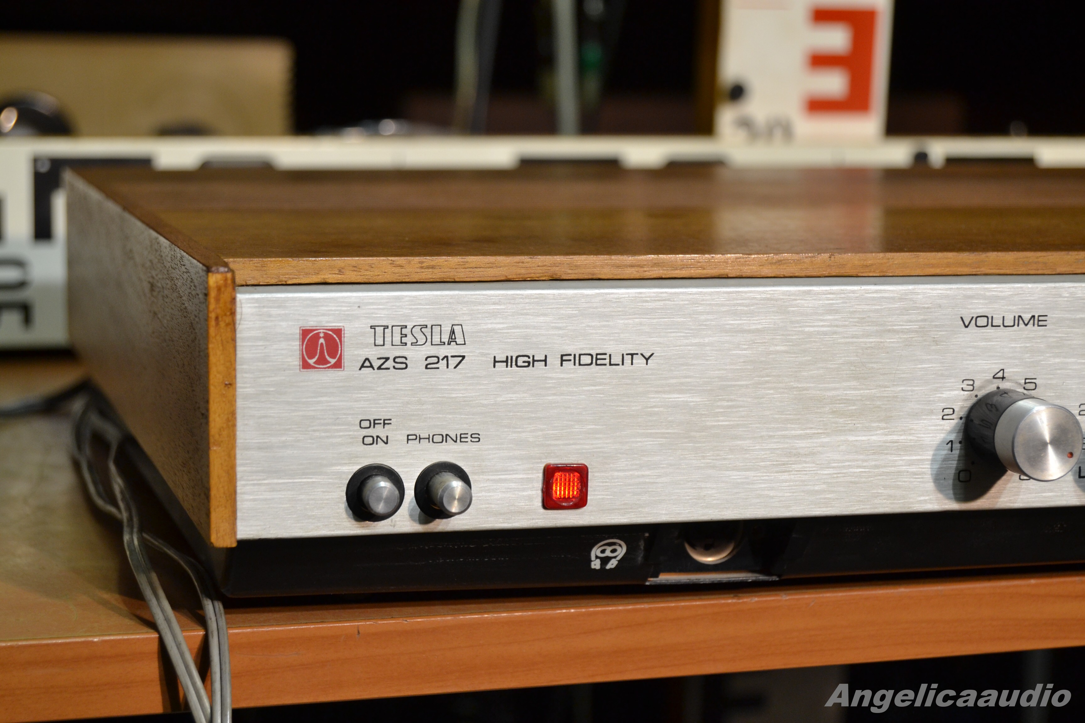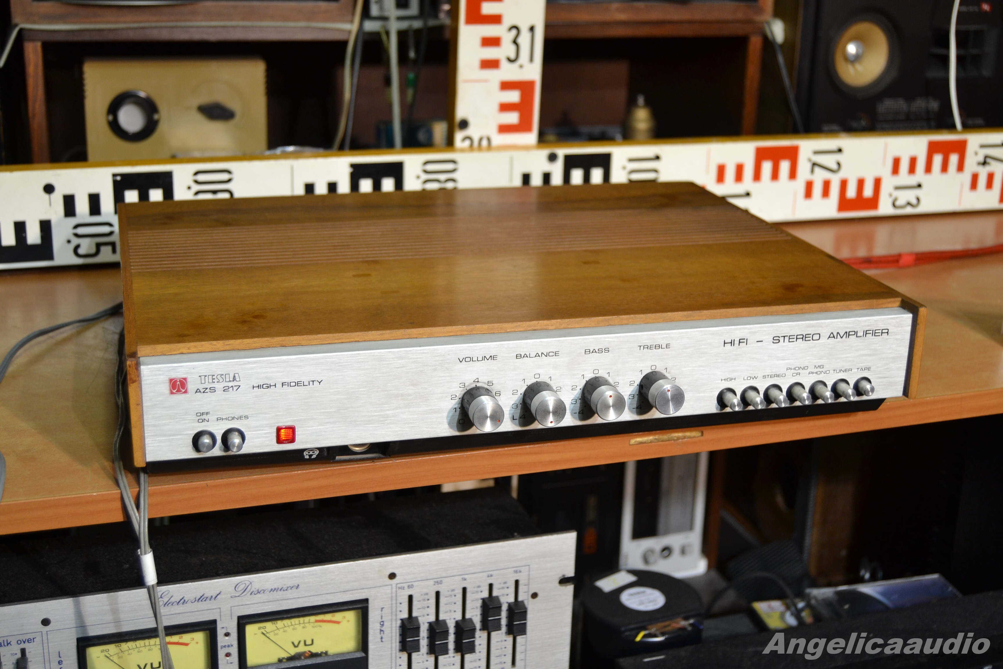 Stereo zesilovač Tesla AZS 217. Levý kanál poprskává – viz video. Nutná údržba. Vzhled viz foto. Knoflík Bass odštíplý kousek černého plastu.