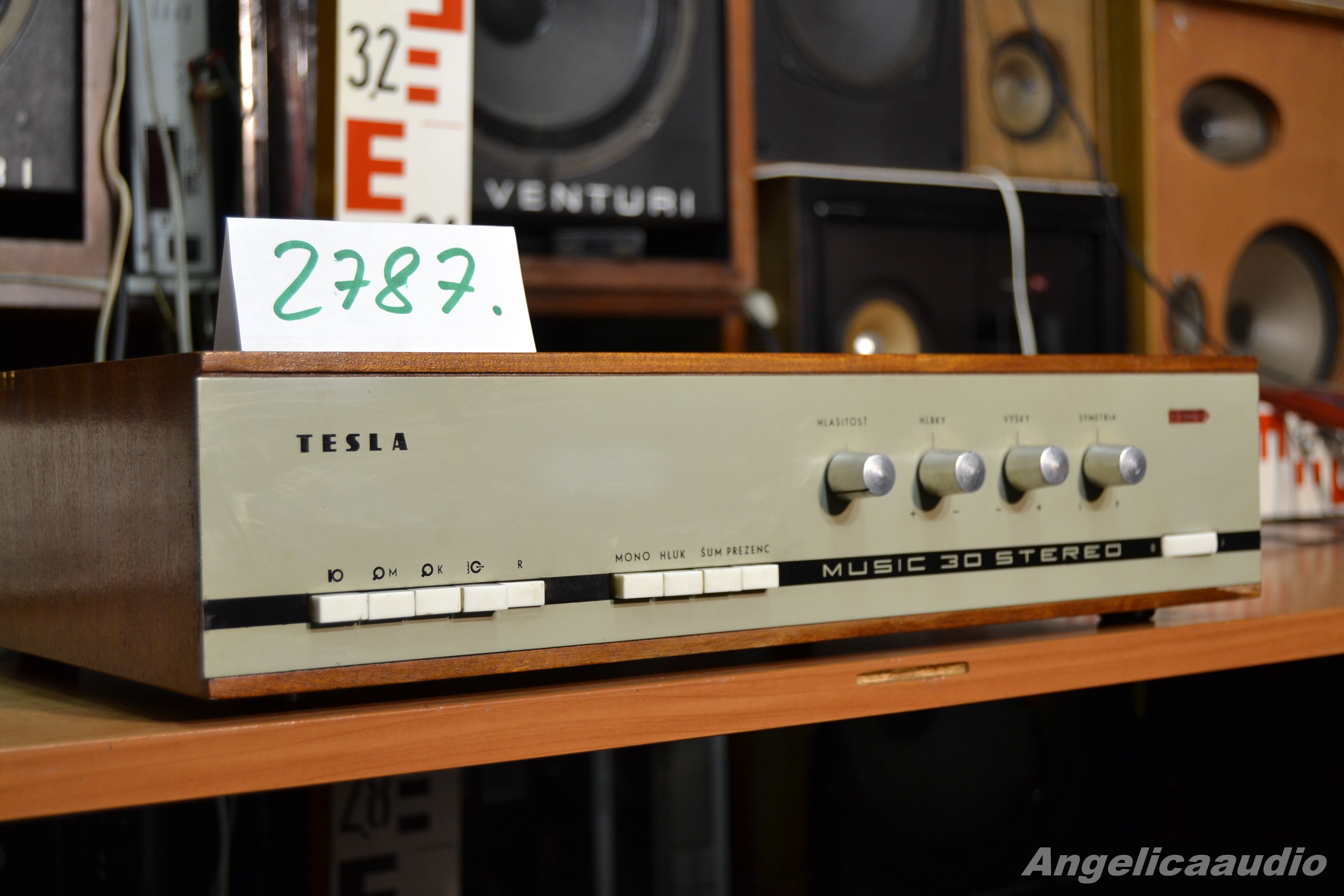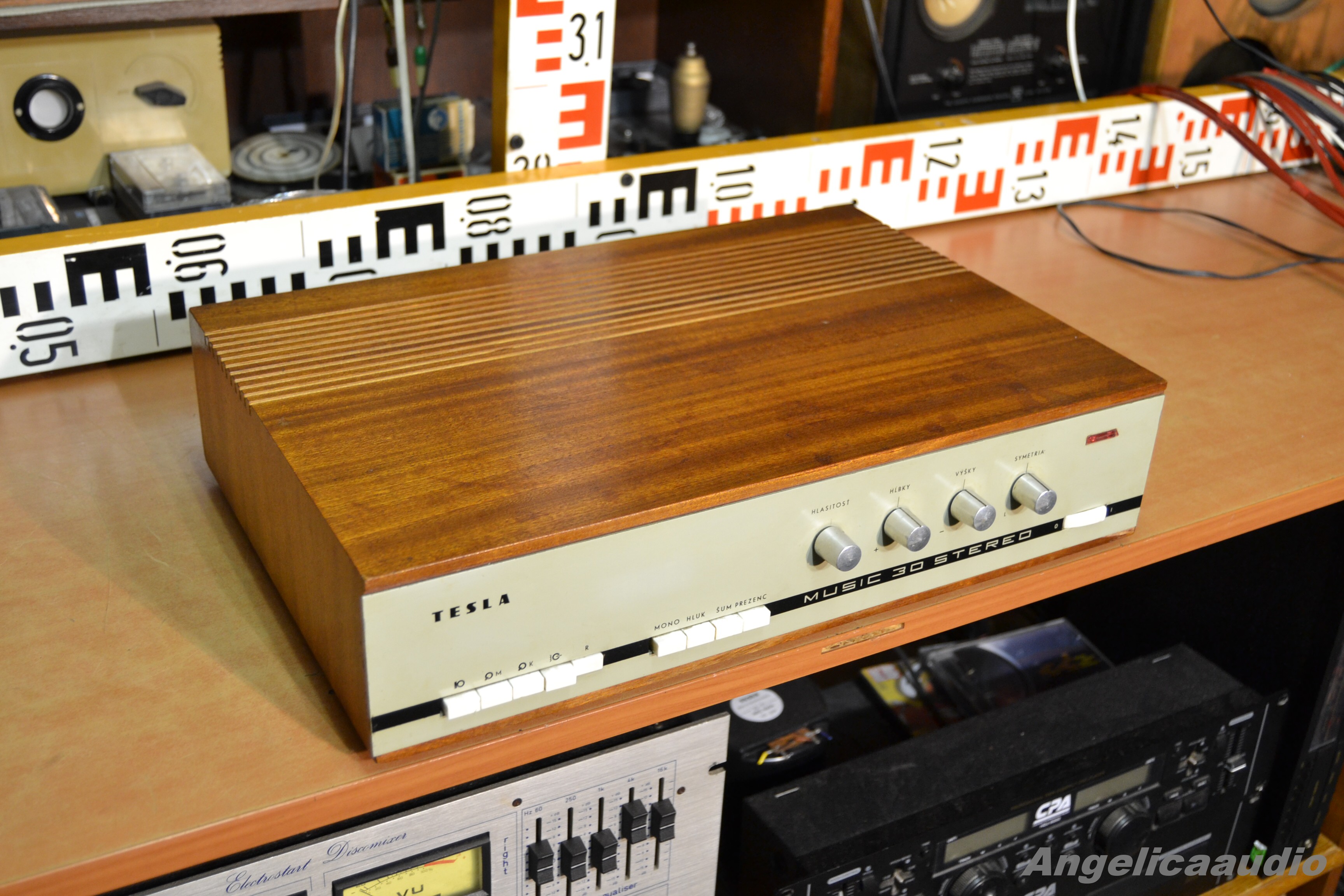 Tesla Music 30 Stereo. Vzhled viz foto. Funkčnost viz video – pravý kanál hraje výrazně slaběji než levý. Na videu je ještě na čelním panelu „propisotový“ nápis Hi-Fi, ten jsem před nafocením zařízení setřel lihem. Takže zařízení je ve stavu viz foto.