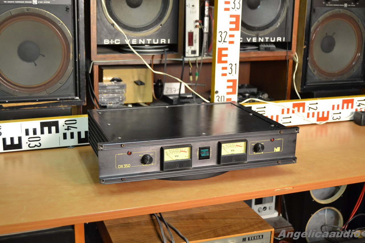 Zajímavý profesionální stereo zesilovač. Označení DX 350M, výrobce L.R.C. Limited (pravděpodobně USA, protože jsou v zařízení použity některé US součástky). Velmi festovní zpracování, slušná váha. Velmi zajímavý vzhled. Bohužel po zapnutí bez reakce – následně otevřeno – viz detailní fotografie. Hlavní pojistka (nad zásuvkou 220V) odpálená, další 2 pojistky – v pouzdrech na krajích zadního panelu O.K., další 4 pojistky v držáčcích také O.K. Po dalším zapnutí zařízení opět shořela hlavní pojistka (bez jakékoliv jiné reakce, nějakého prsknutí či čehokoliv jiného). Závada nehledána. Do prodeje jako zařízení k opravě.