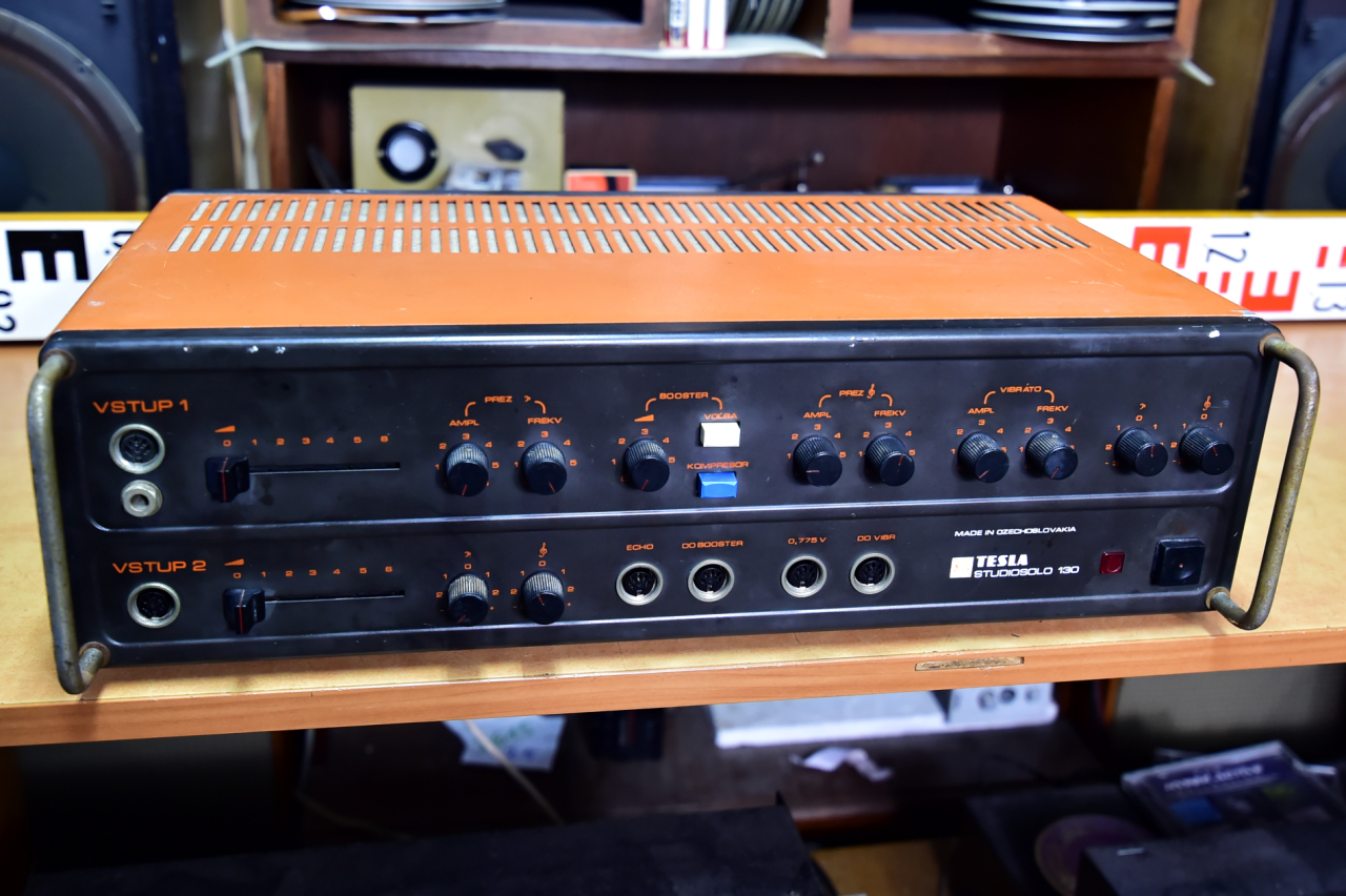 Profesionální mono zesilovač Tesla Studiosolo 130. Zařízení k údržbě. Bez šroubovacího víčka hlavní pojistky, bez pojistky. Bez síťového kabelu. Schází 1 šroubek horního krytu a síťová zásuvka je mírně nakřivo. Dále viz video.